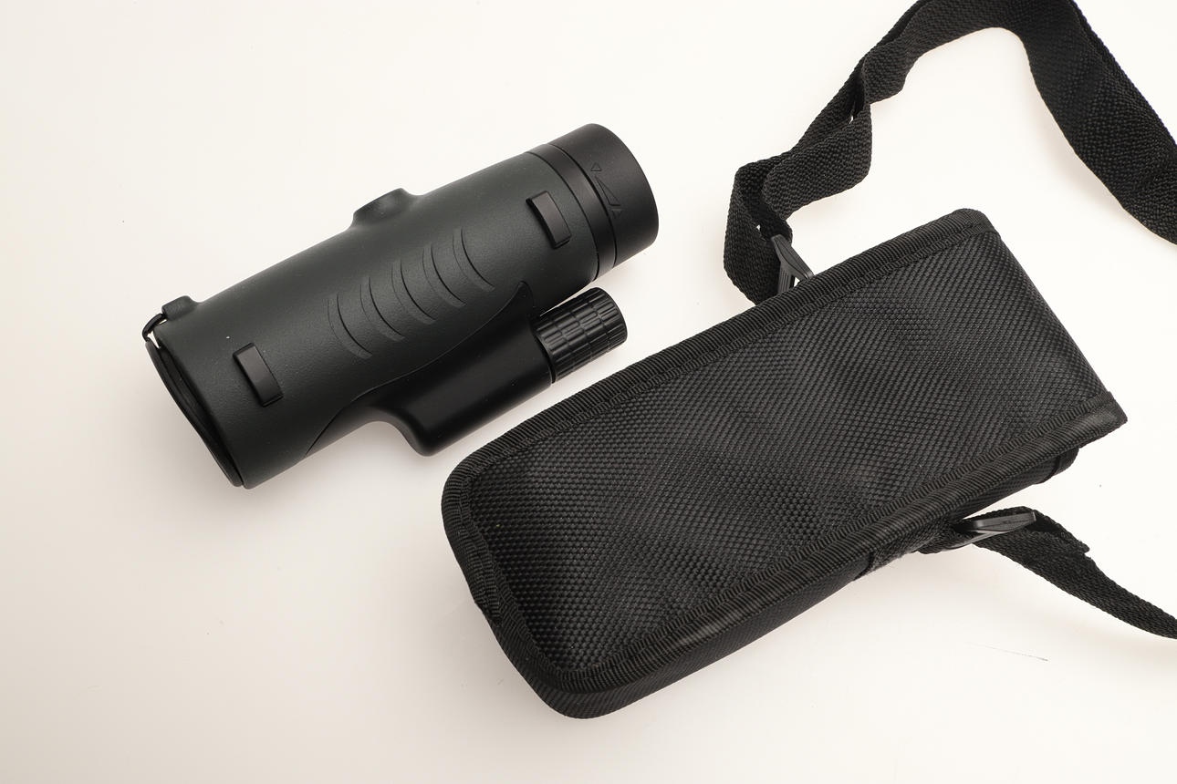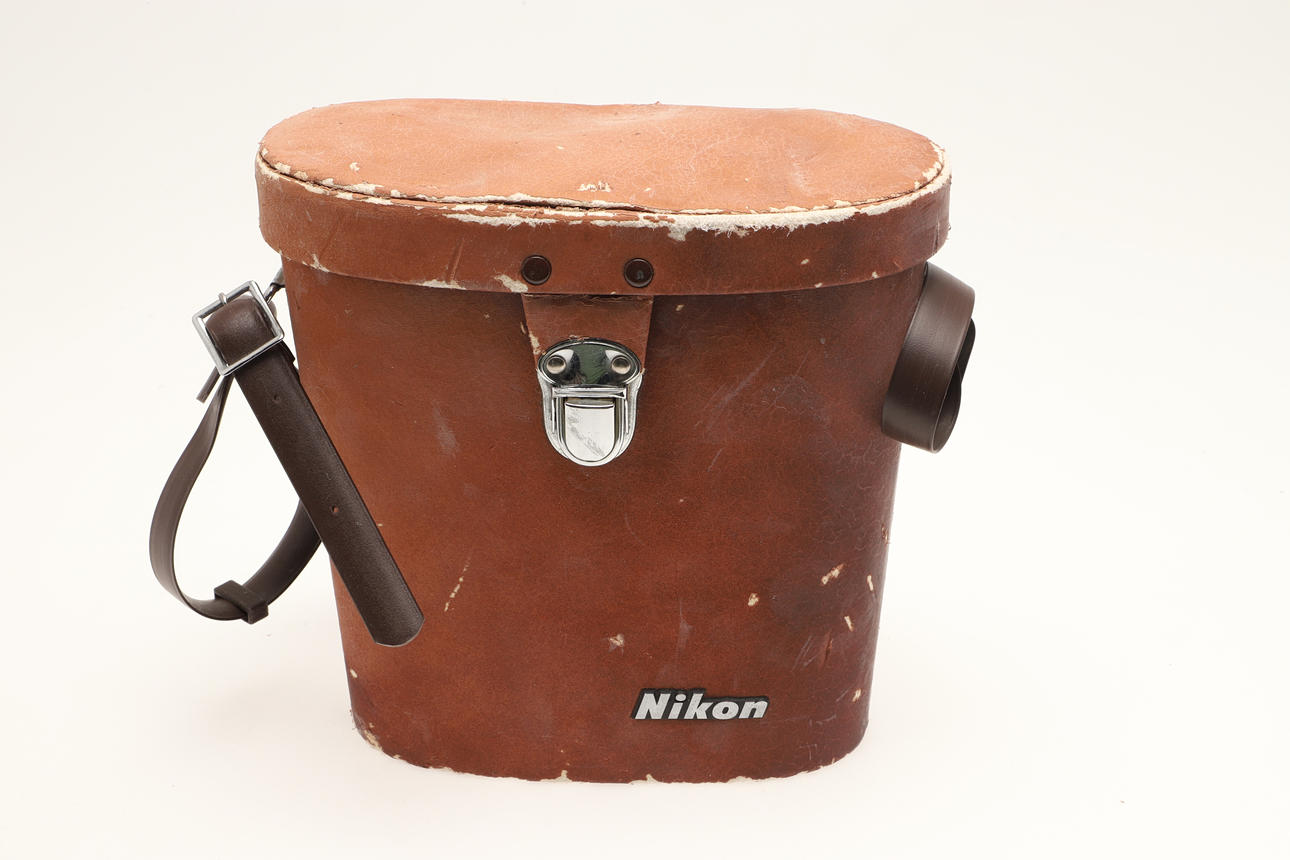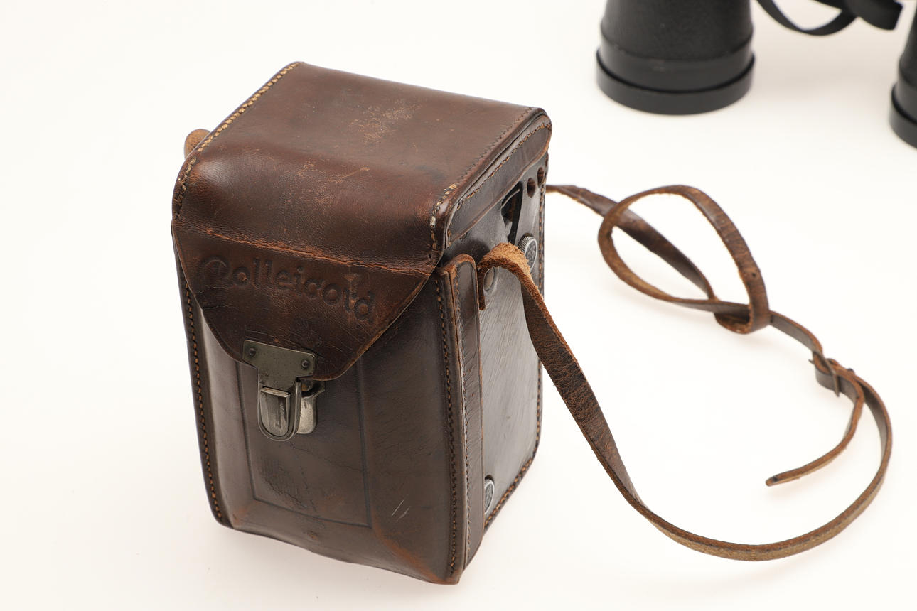 The Rolleicord camera with Carl Zeiss lense, together with a pair of Nikon 7 x 50 binoculars, a Pulaisen 10 x 42 scope spotter, a Pentecon 2.8/100 lense, and a Chesterman field measurer.