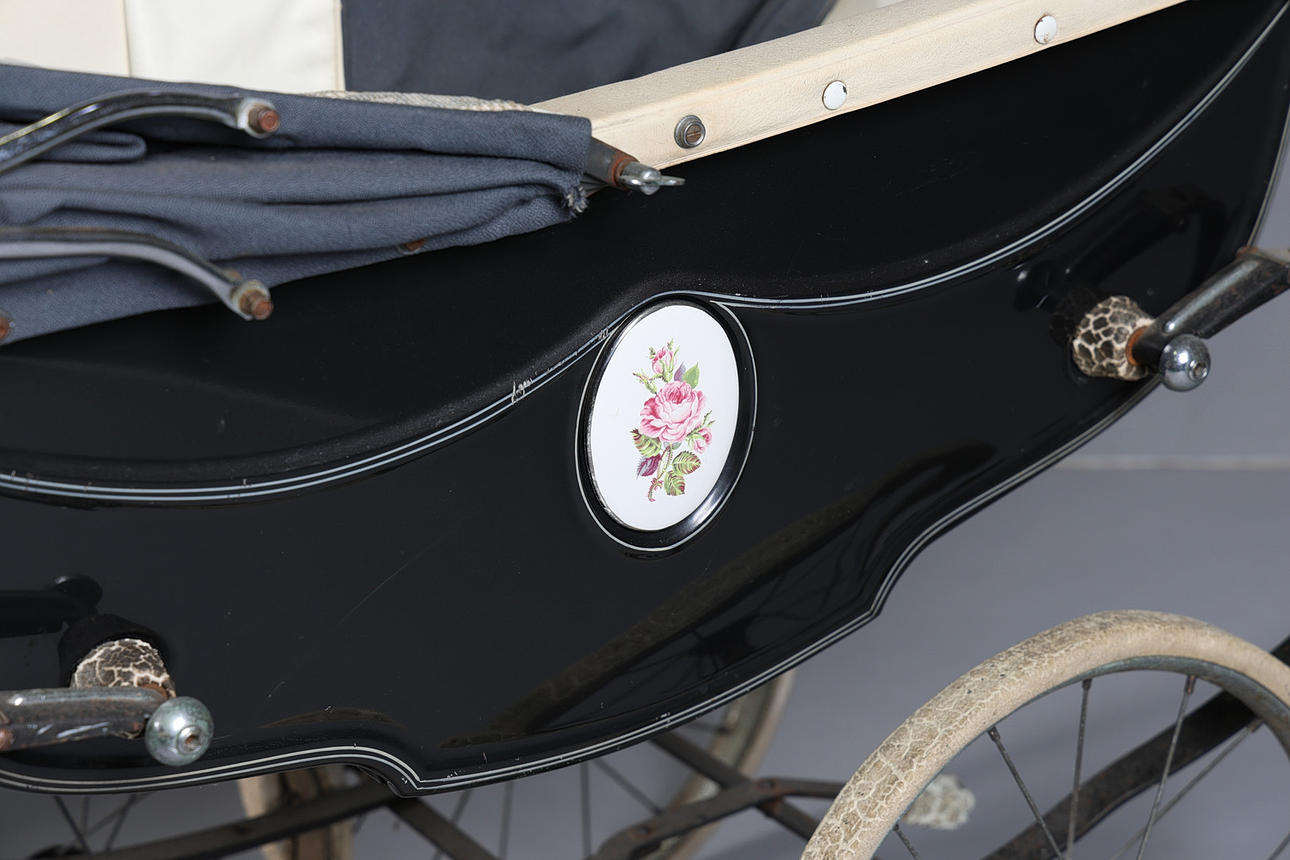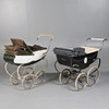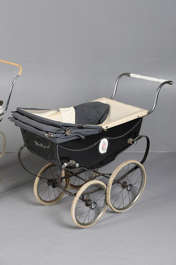 To include a Silver Cross pram with hood in black and white, the side decorated with a floral ceramic plaque, together with a Tri-ang example in white and dark green. (2).