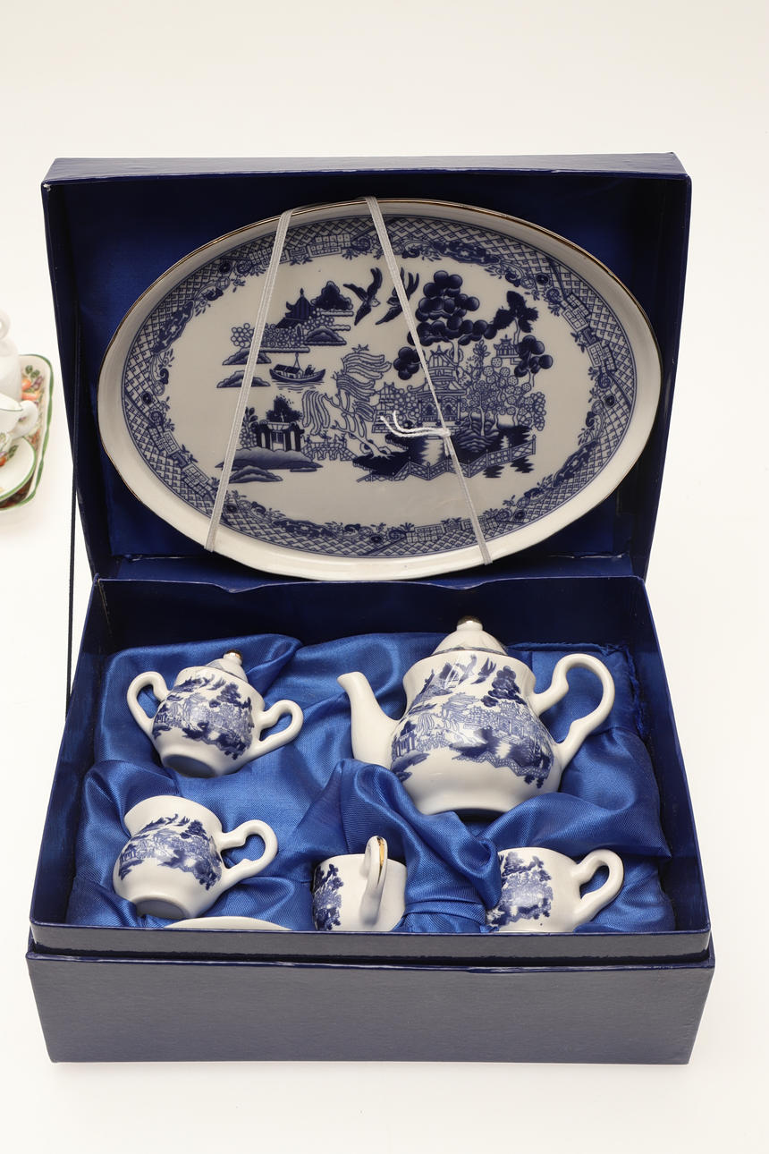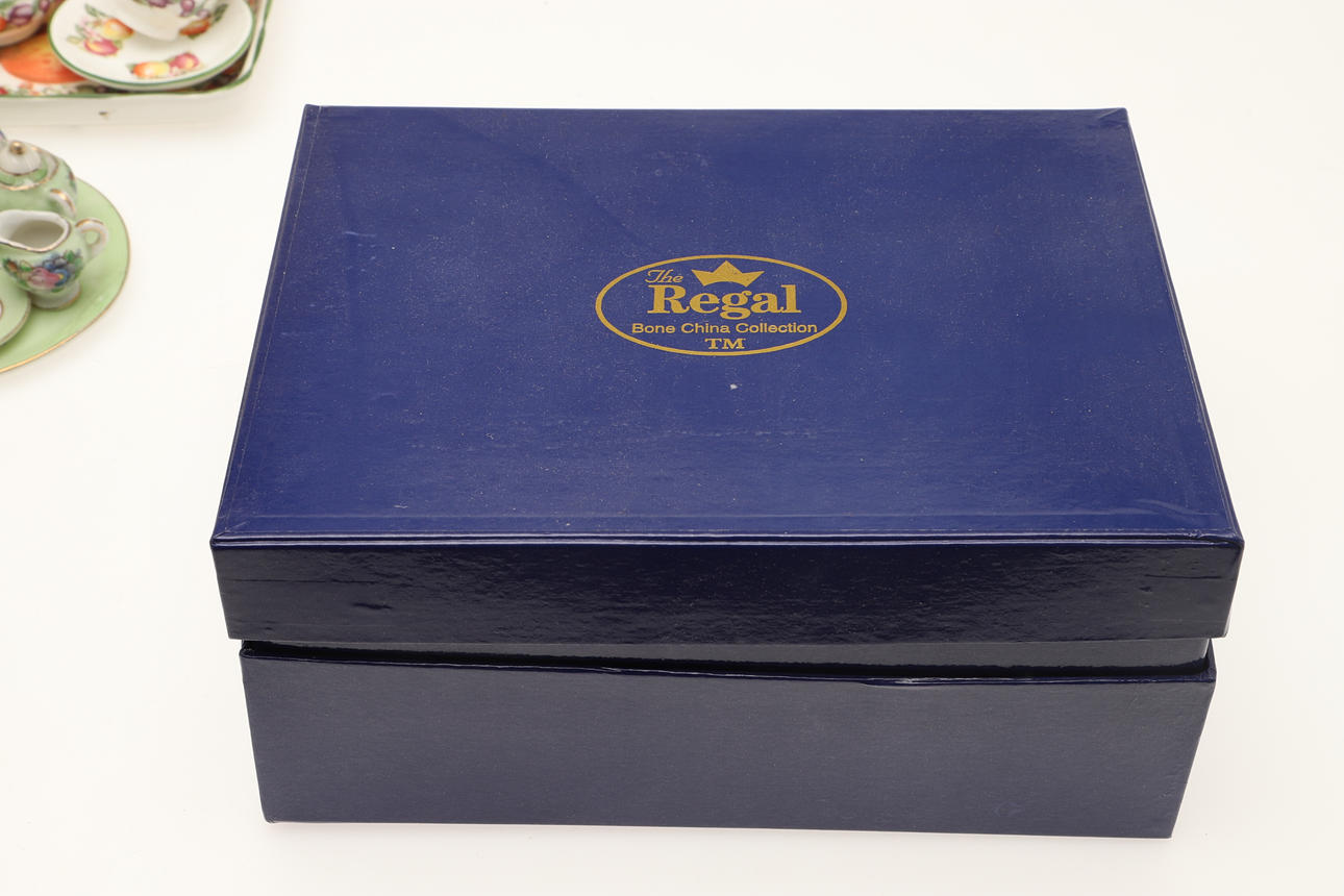 Two Regal teasets, one in the Willow pattern, boxed, the other with fruit pattern, a teaset with butterfly decoration, a Japanese-made teaset, a Hammersley teapot and two miniature Limoges items.