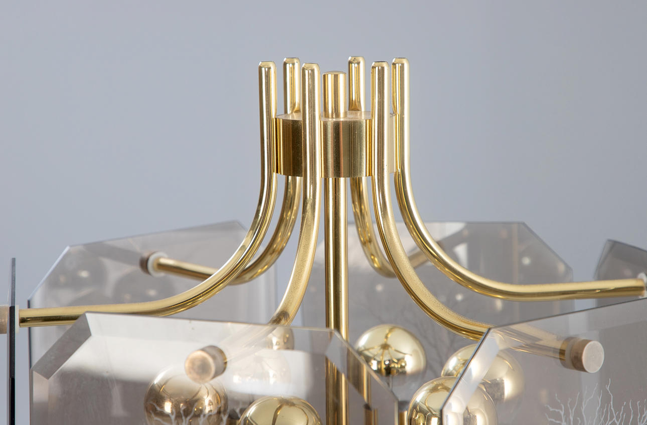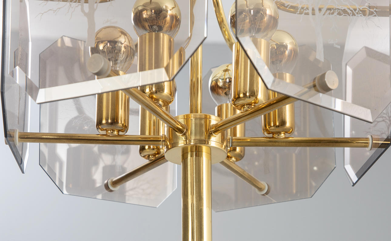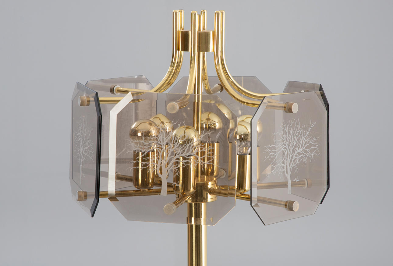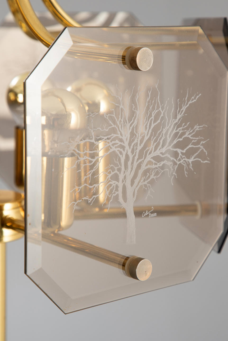 'Colani Tree' floor lamp from the 1970s. Brass frame Shade consisting of individual smoked glass panes with an etched tree motif and 'Colani' signature. 6 lighting points, E14 sockets.