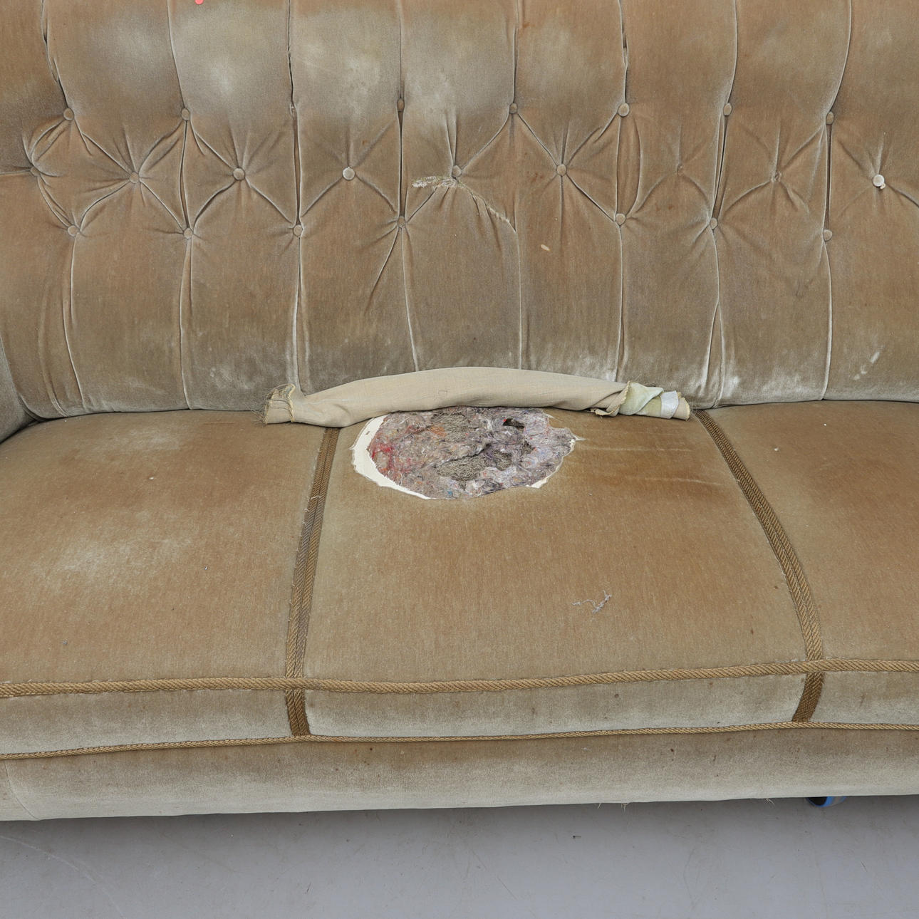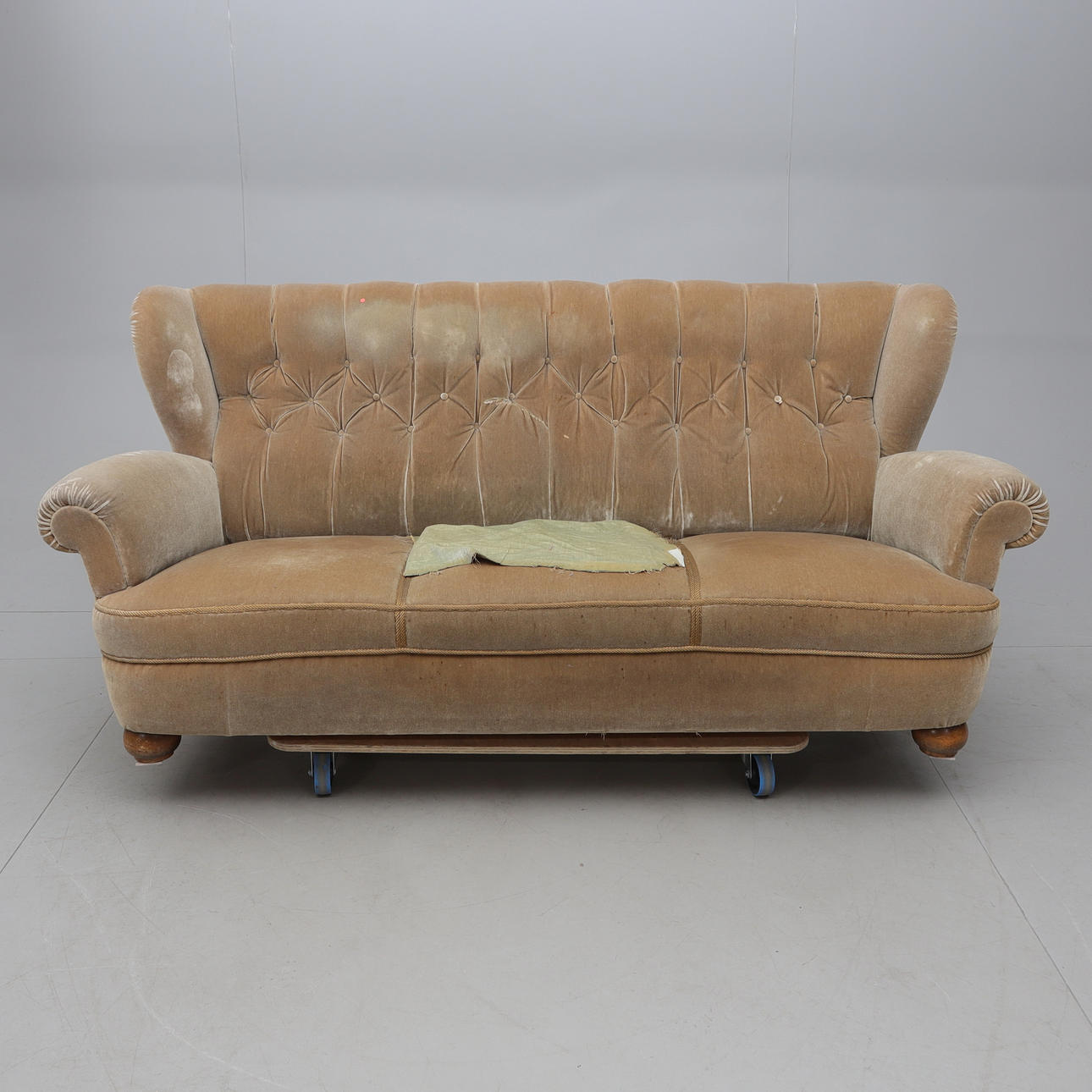 Wear and tear. Stains and damage. Needs renovation/new upholstery.