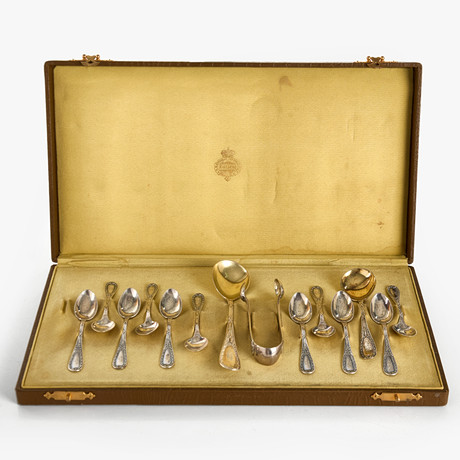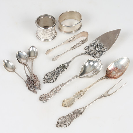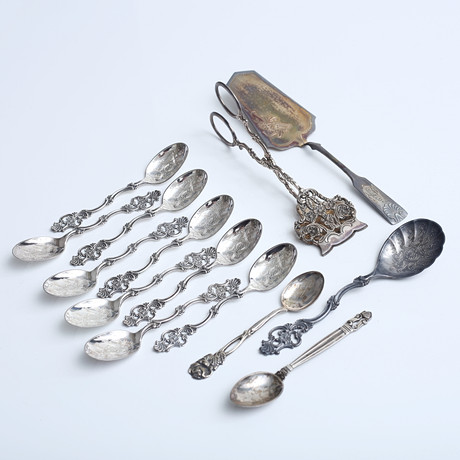 4358165. COLLECTION SMALL SPOONS different models 13 pcs and CAKE TONGS, silver.