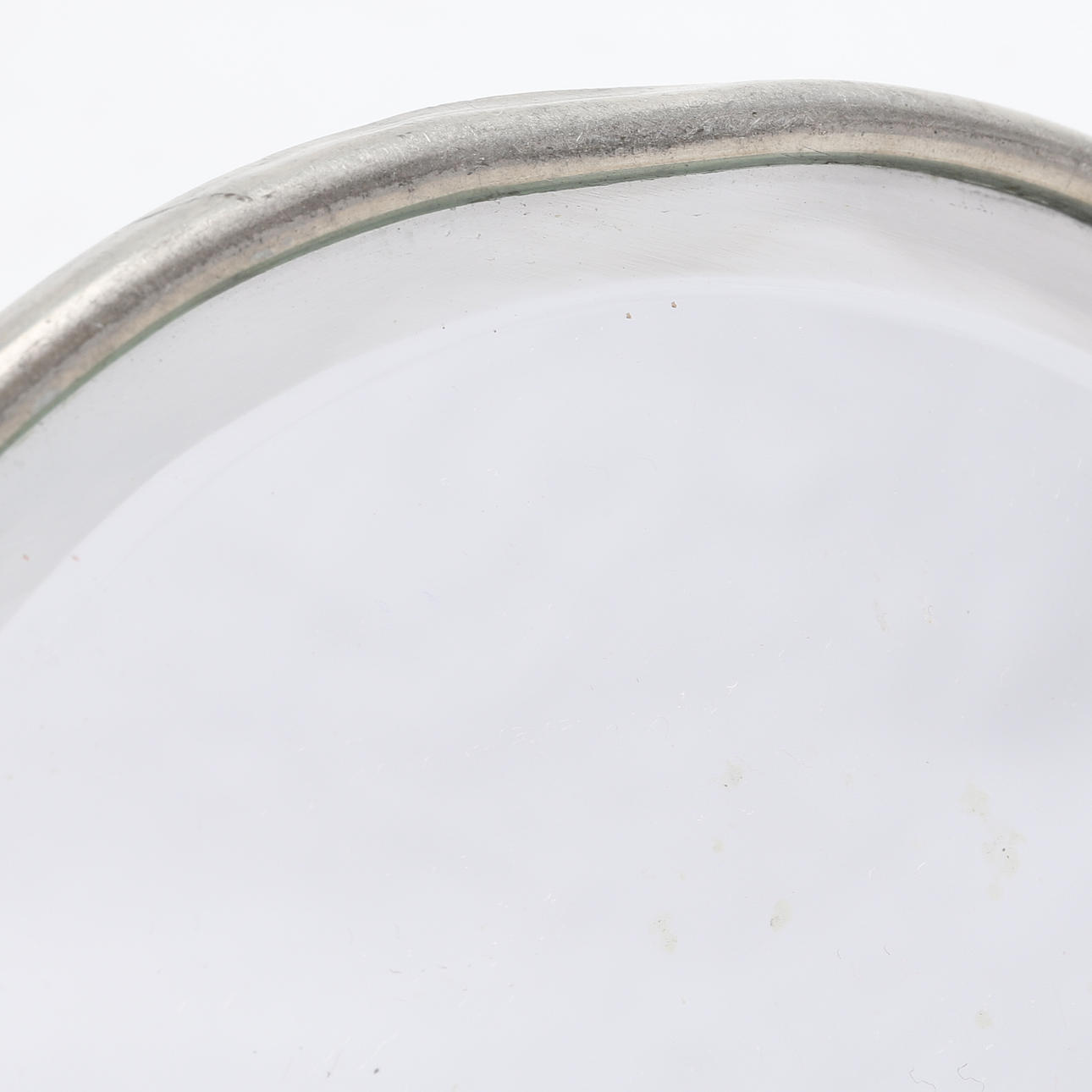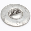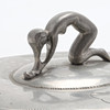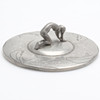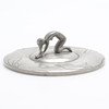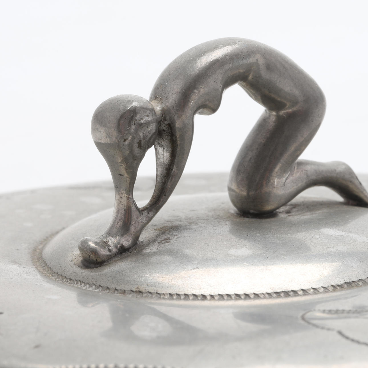Tin. Handle in the form of a figure, with engraved decor. Diameter 15 cm.