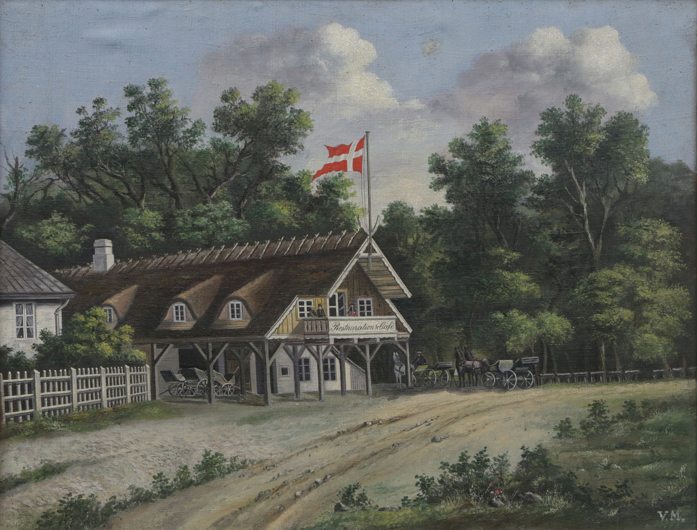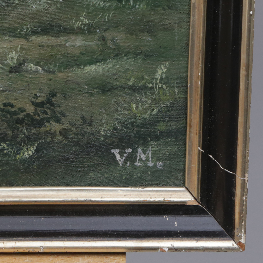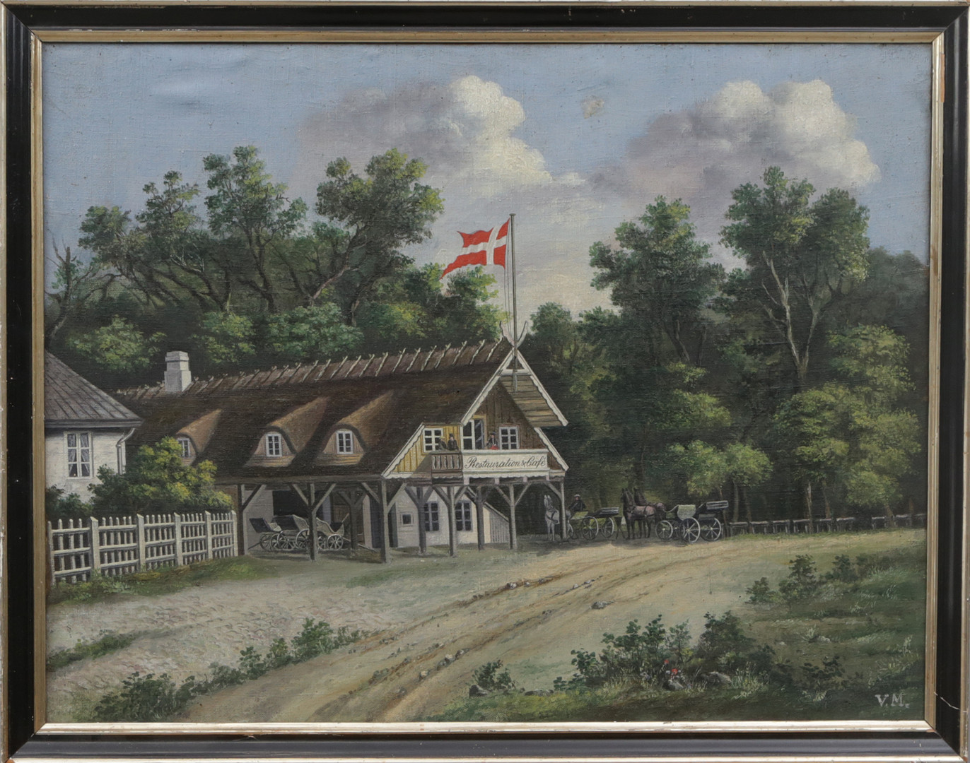 4358609. OIL, on canvas, Farm environment with Restauration and Café, signed V.M. Probably 19th century.