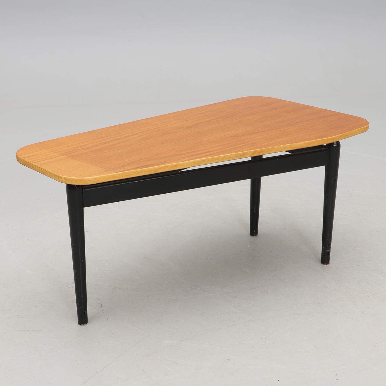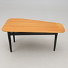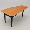 Disc veneered with teak, edge of beech. On three black-lacquered legs. Length 108, width 56, height 54 cm.