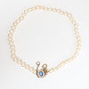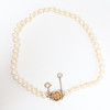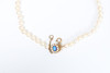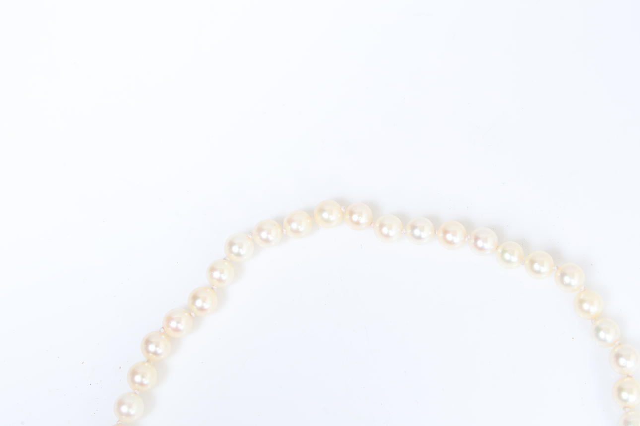 The necklace formed from a single strand of forty-seven pearls measuring 6mm diameter approximately, the 14 carat gold clasp with central opal surrounded by a ring of pearls, with security chain, 35cm long.