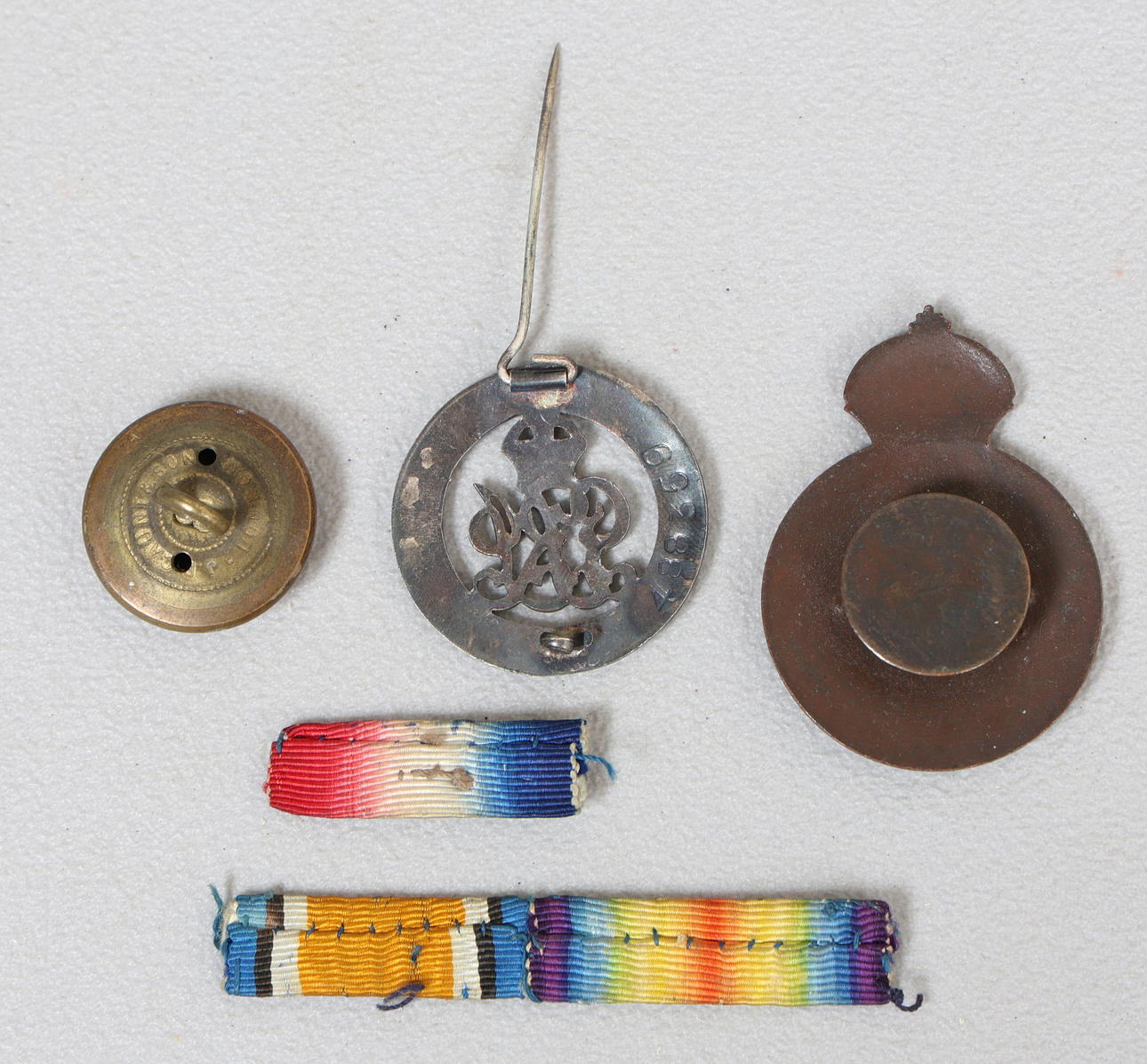 Military badges including WW1 Silver War Badge No 488359, issued to 209609 Acting Lance Corporal Arnold Fox, Labour Corps, he enlisted in the 1/16th (Queens Westminster Rifles) Battalion The London Regiment on 19th May 1913 with the regimental number 1558, entered France on 1st November 1914, entitled to the 1914 Star With Clasp '5th AUG.–22nd NOV. 1914', 1914-1918 British War Medal and Victory Medal, transferred to the Labour Corps with the service number 209609, discharged (sick) 18th September 1919, medal ribbons for 1914 Star with rosette, BWM, Victory Medal, Metropolitan Police Special Constabulary lapel badge, Kings Crown Royal Artillery tunic button.