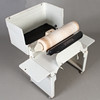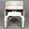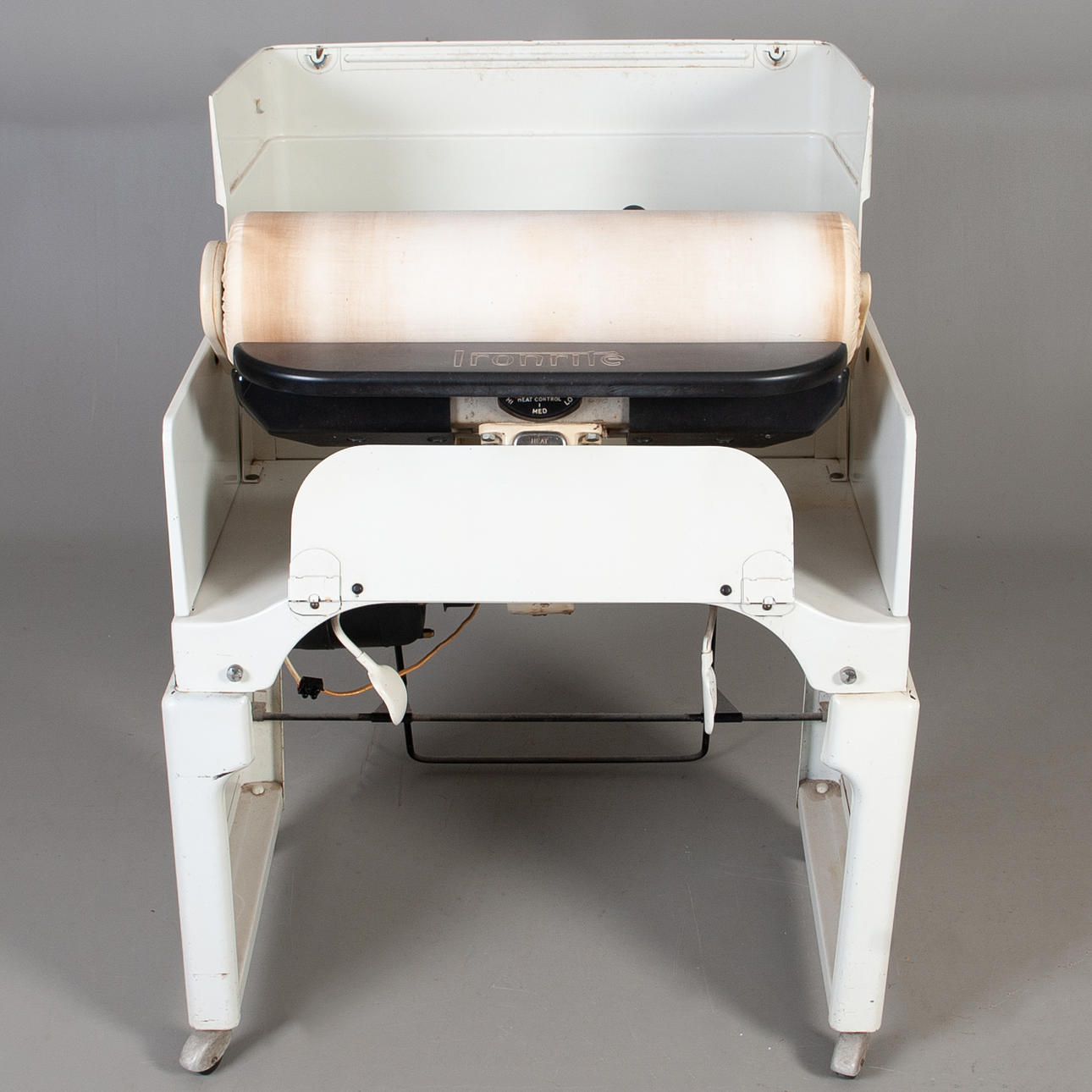 Electric mangle in white lacquered sheet from the American Ironrite Ironer Company, Detroit. Model with fold-down cover and textile roller. Typical of post-war household appliances with functionalist design and rounded shapes.