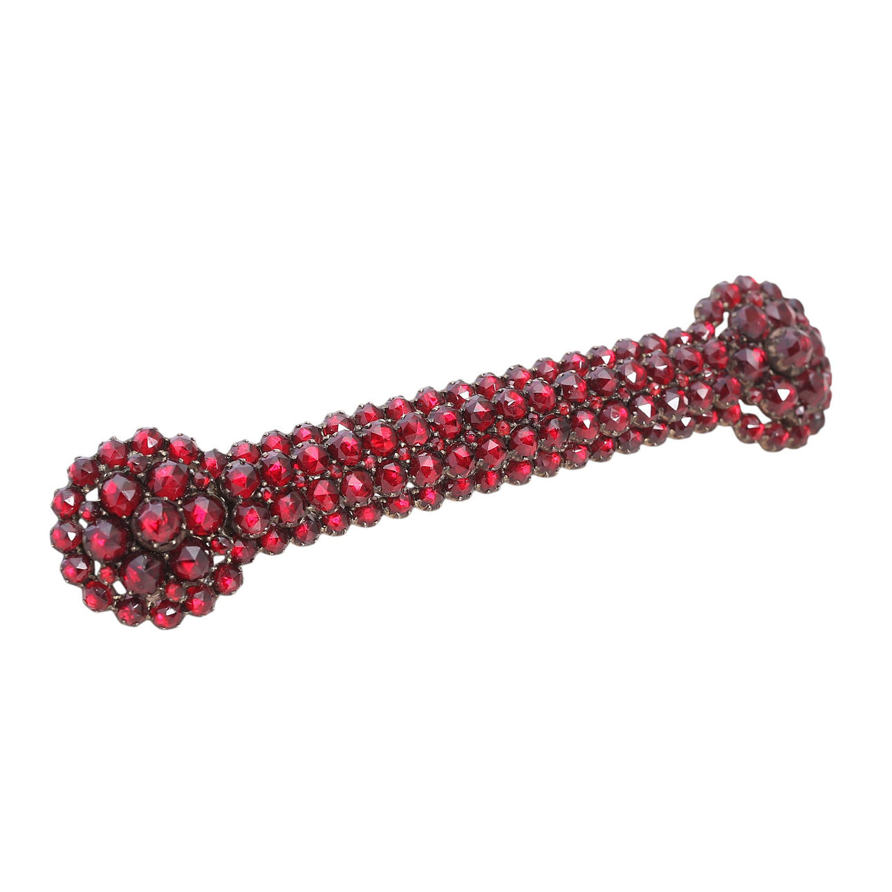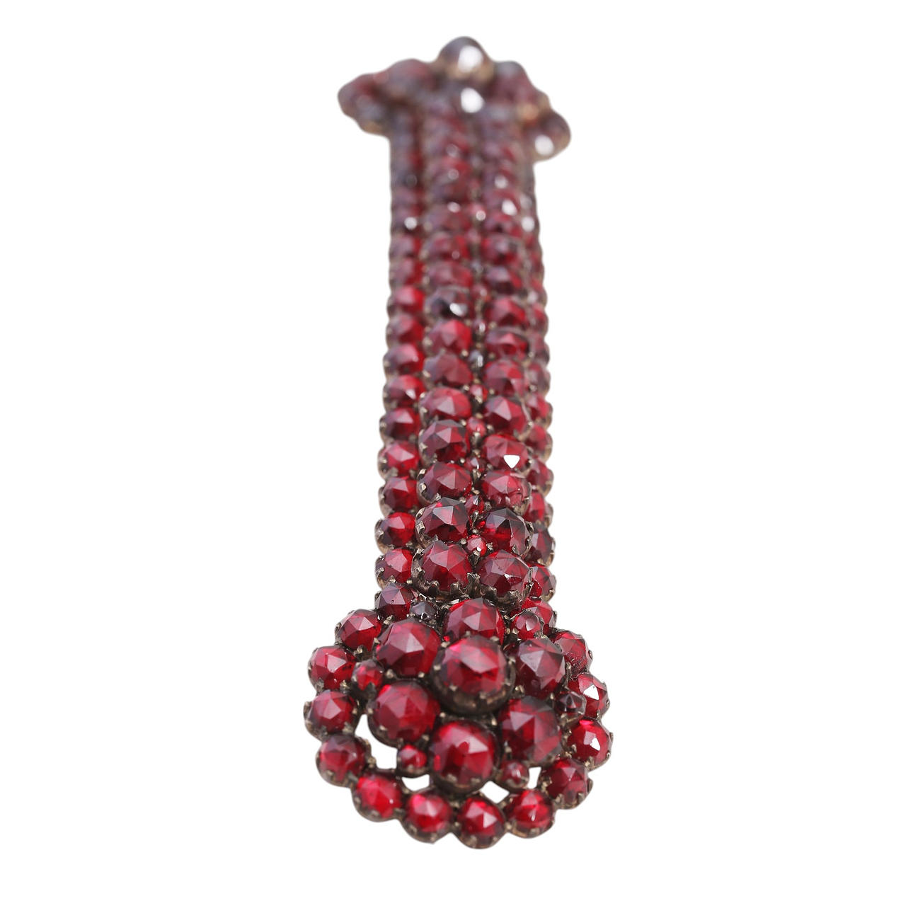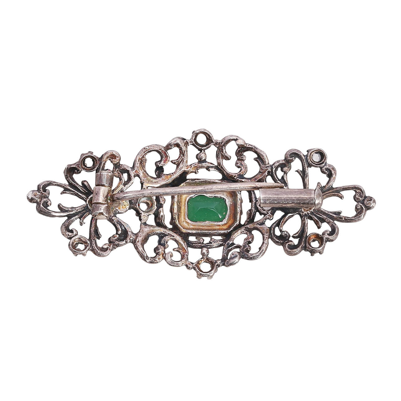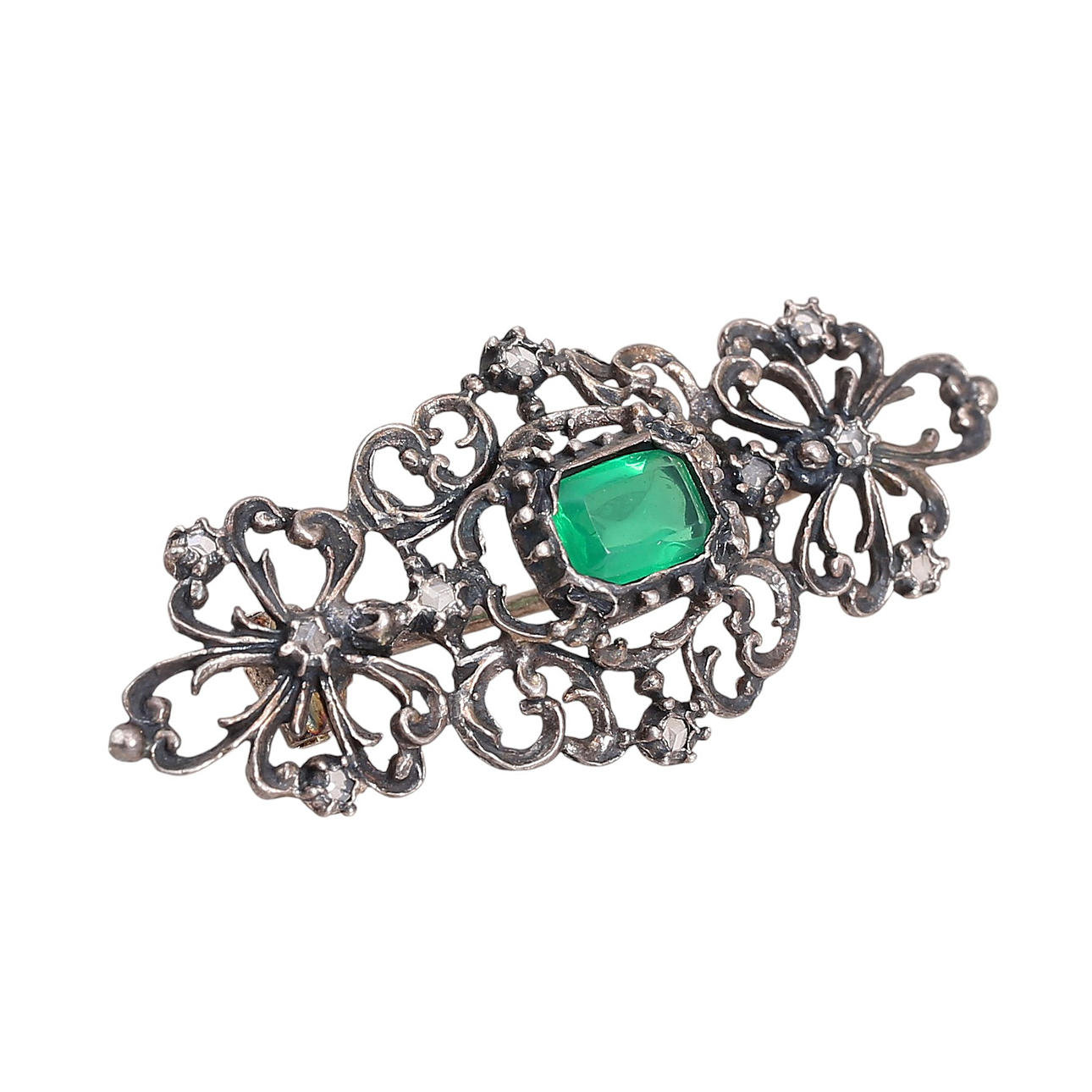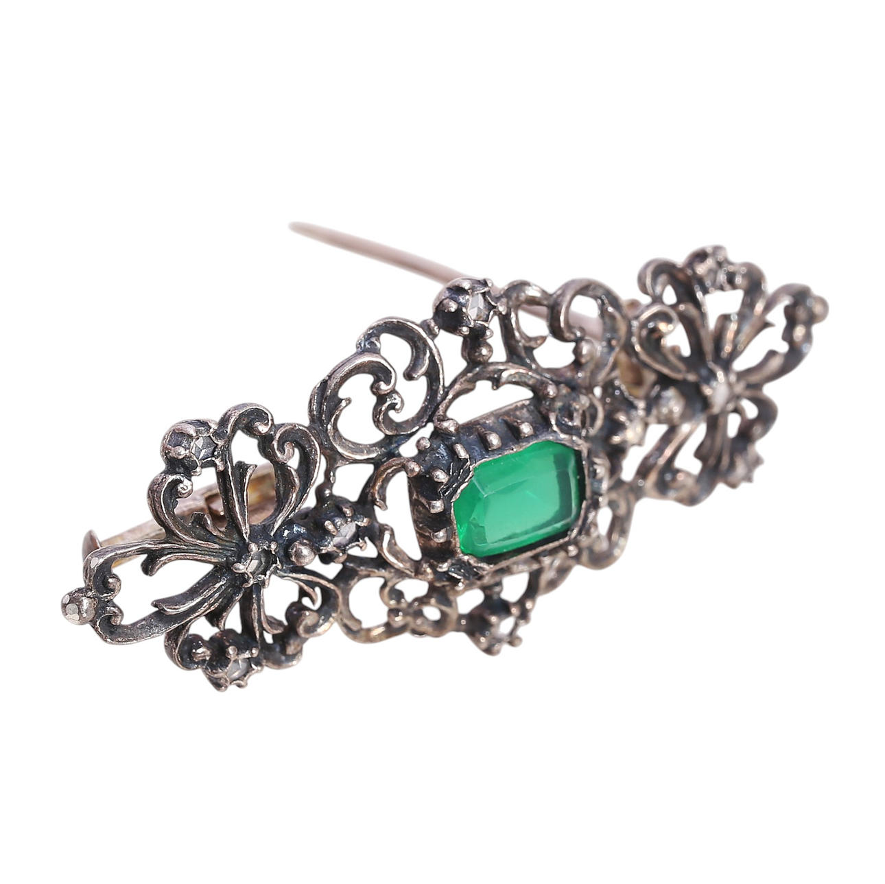 Silver, over-gilded metal, colourless sapphires, garnets and emerald-like glass. 4.4 x 1.9 cm. 9.3 x 2 cm. 18.6 gr.