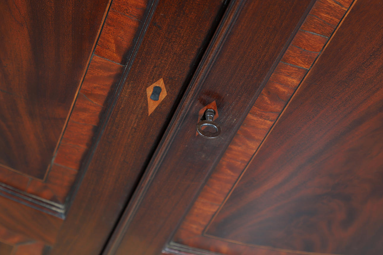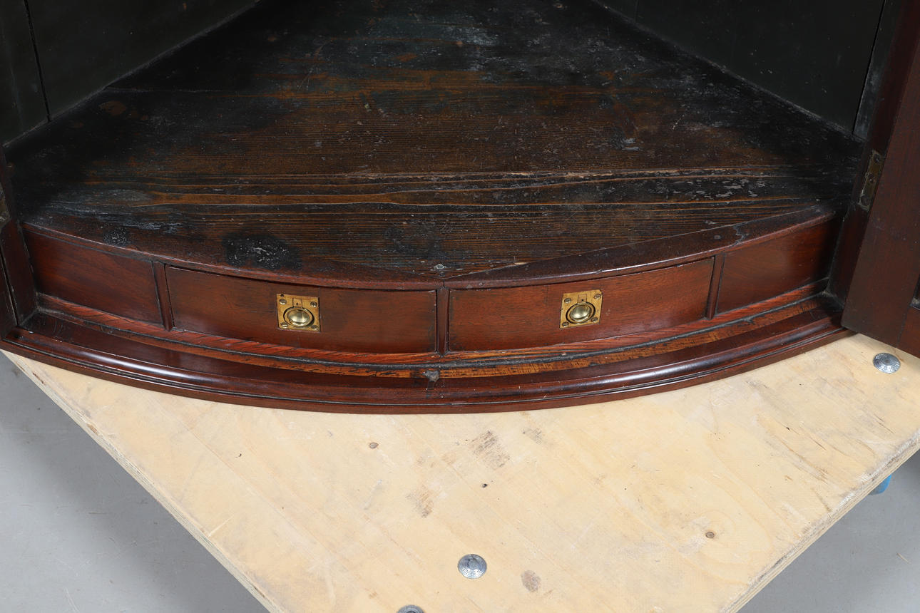 4360843. AN INLAID MAHOGANY CORNER CUPBOARD.