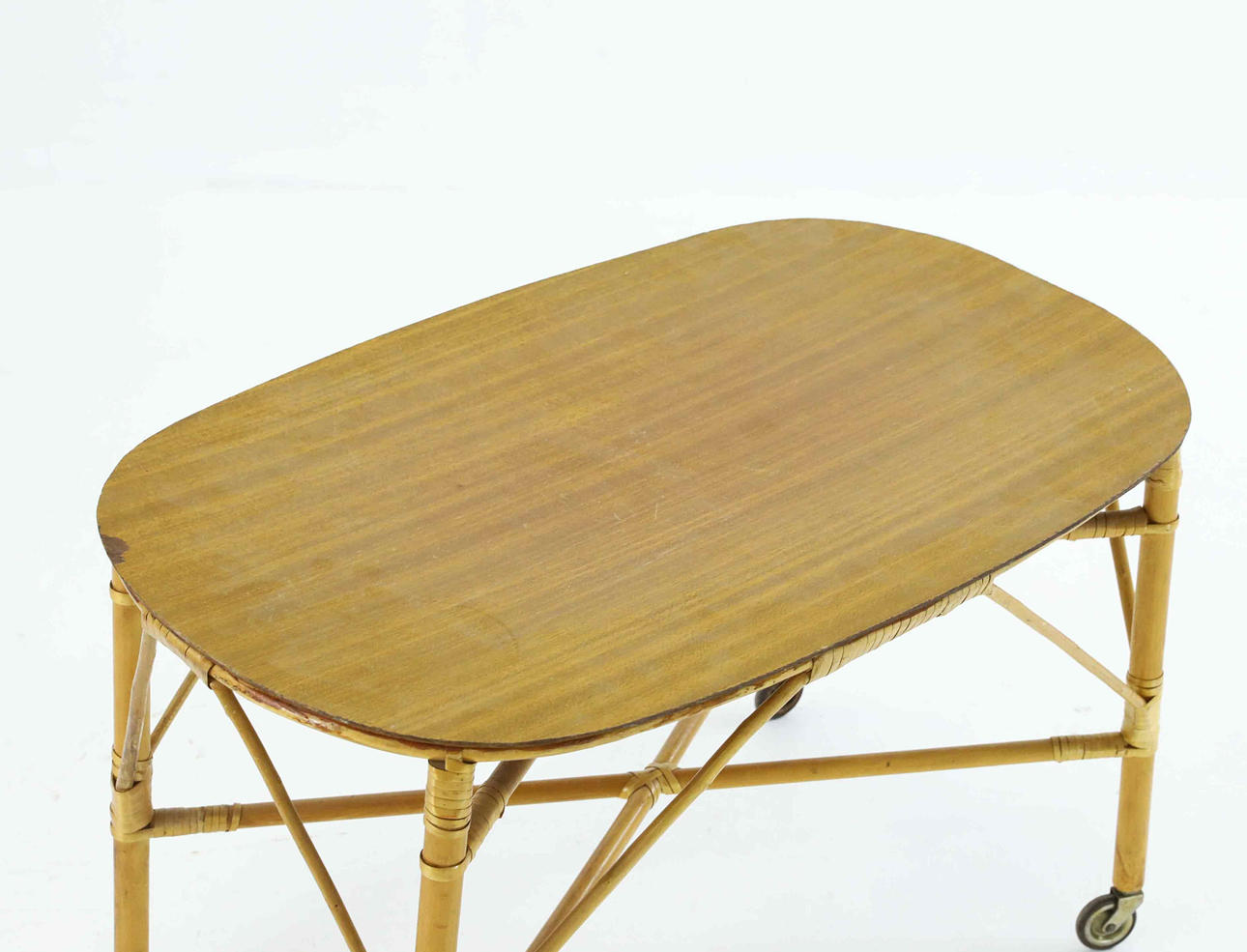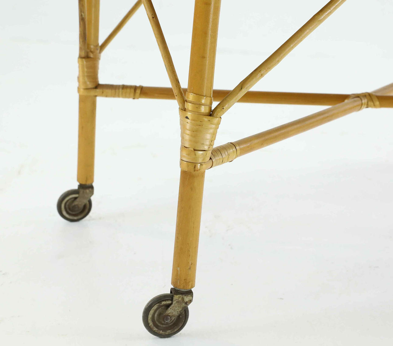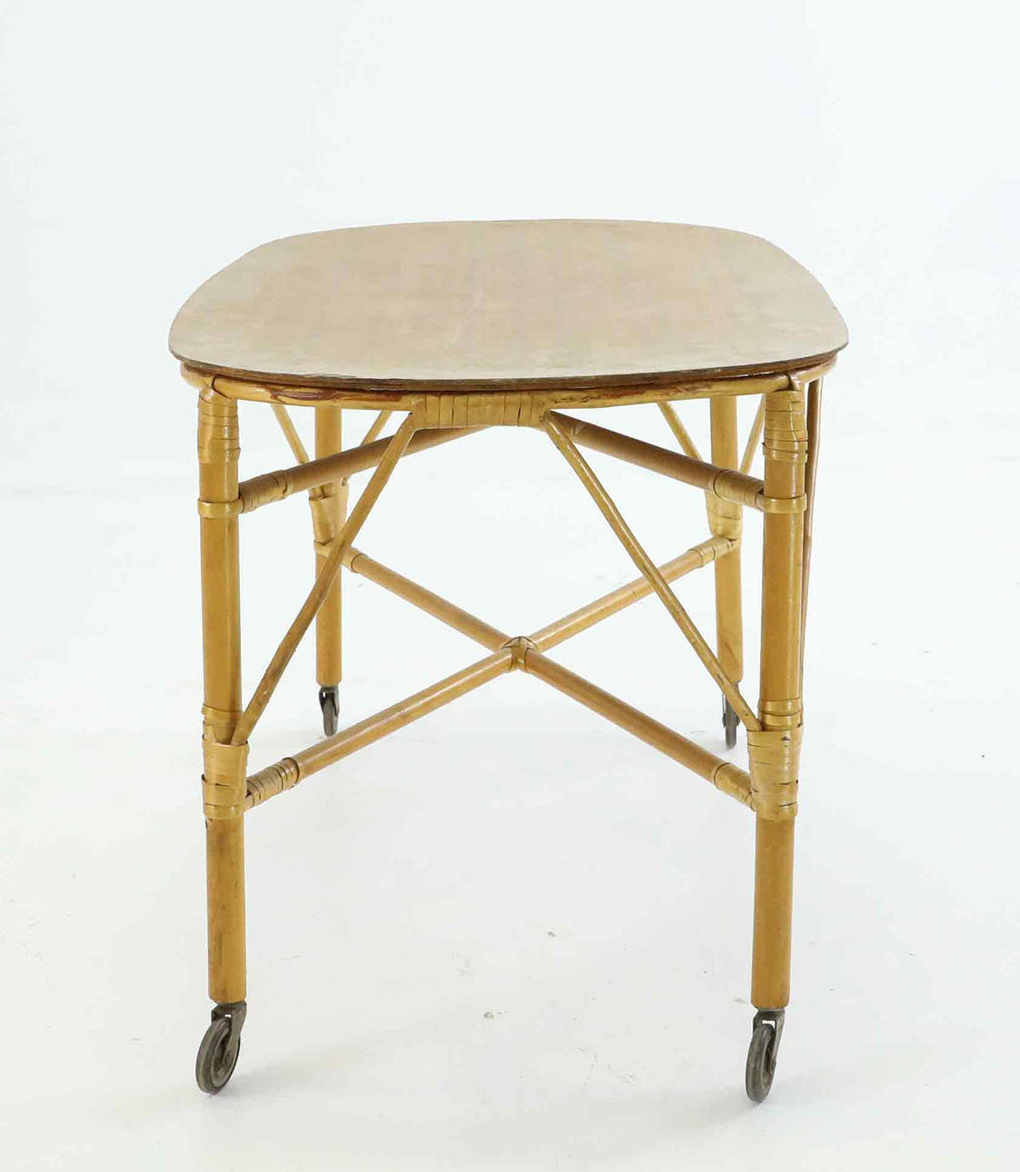 4360887. TABLE WITH WHEELS, rattan, bamboo, mid 20th century.