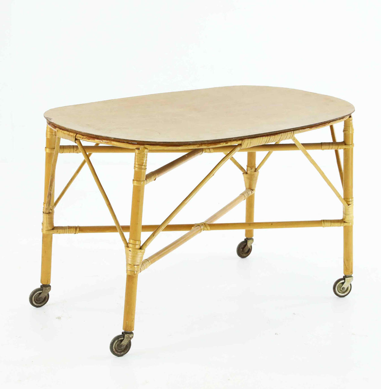 TABLE WITH WHEELS, rattan, bamboo, mid 20th century.