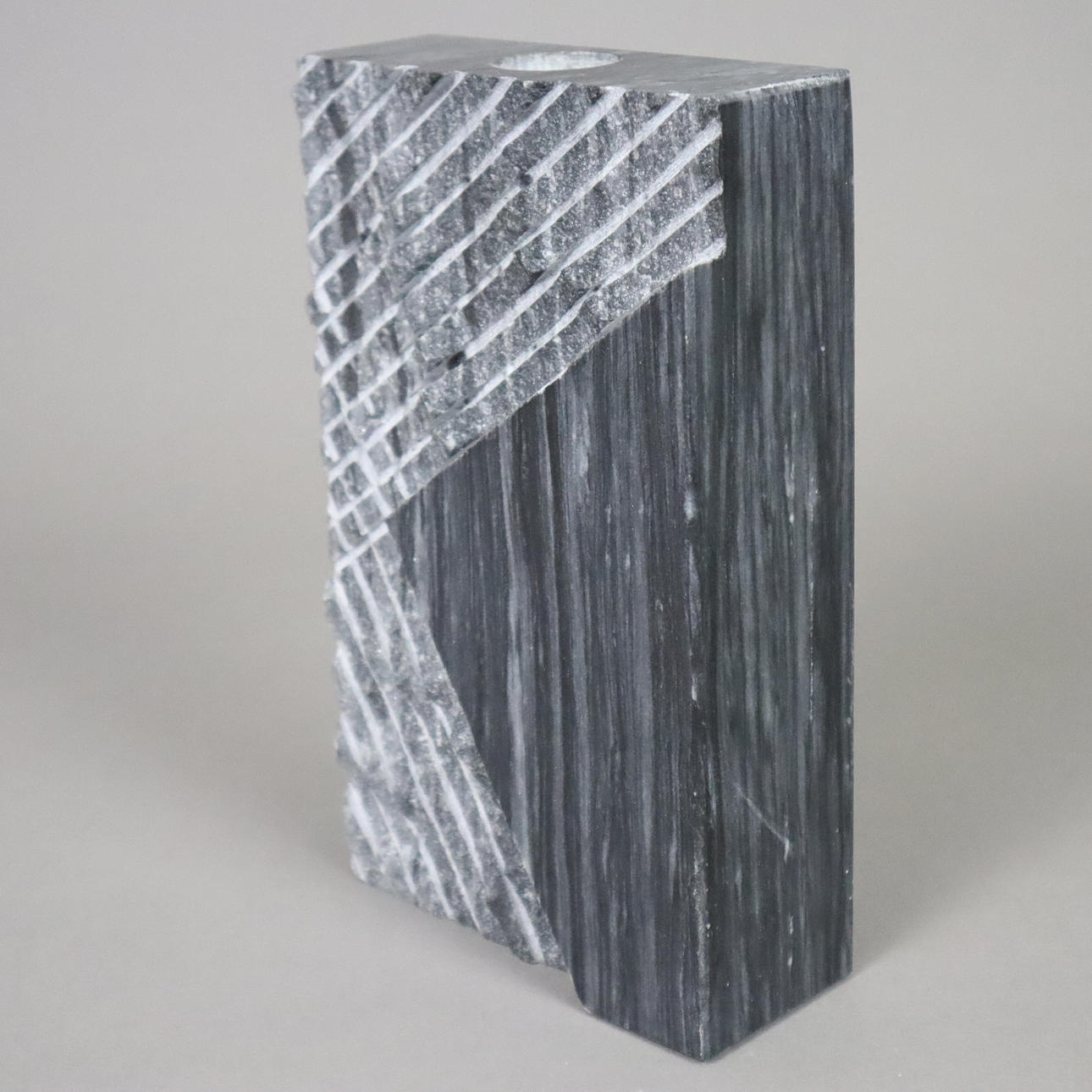 partly polished, textured face with geometric pattern, narrow opening (2.8 cm diameter), l.xb.xh. cca 12.8 x 5.2 x 20.5 cm, weight approx. 3133 g.