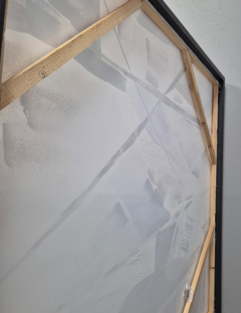 mixed media on canvas, framed, 102.5cm x 102.5cm.