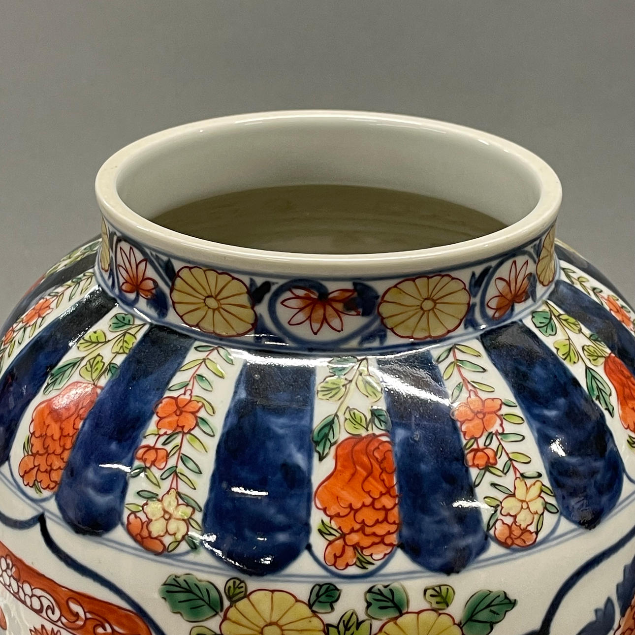 A pair of Chinese hand painted Imari style porcelain jars and lids, H. 38cm.