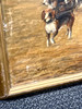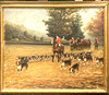 A framed oil on board hunting scene, size 73cm x 59cm.
