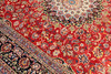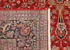Main field with dark base color, center medallion and corner ornaments. Main fields also feature palmette and arabesque crane decoration. Main border with red base color and stylizing motifs.