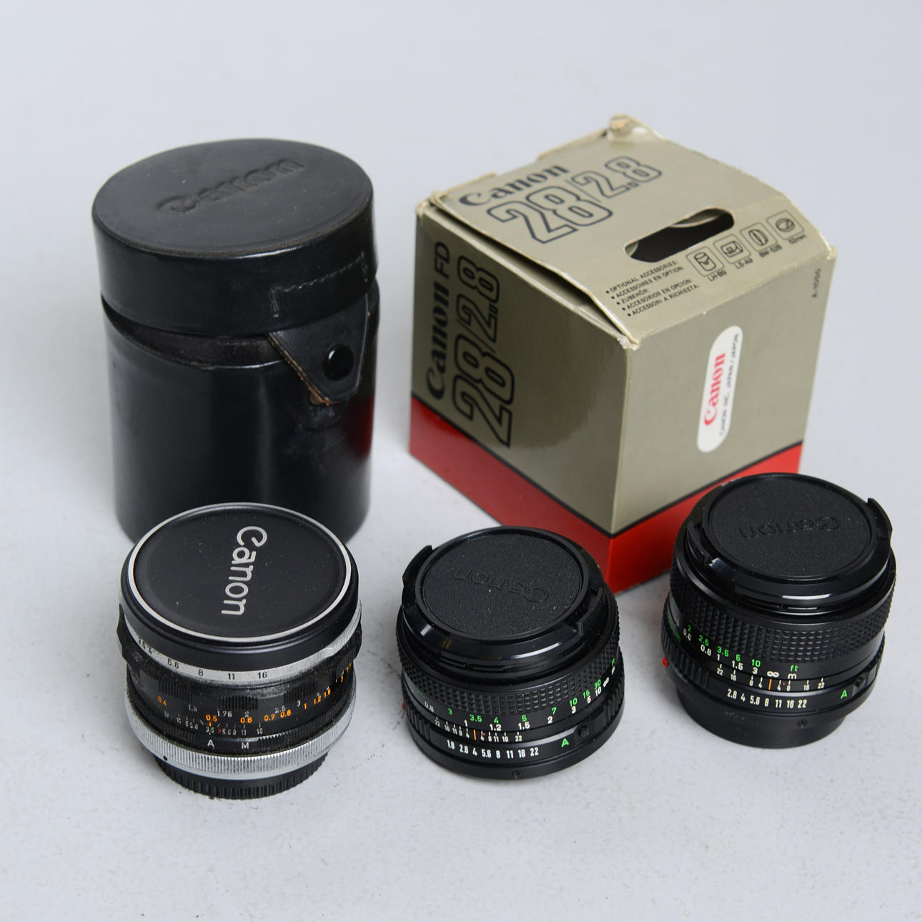 Canon 28/2.8. Canon 50mm 1:1.8. Canon FL 28mm 1:3.5. 40x30x20 cm, 5 kg.