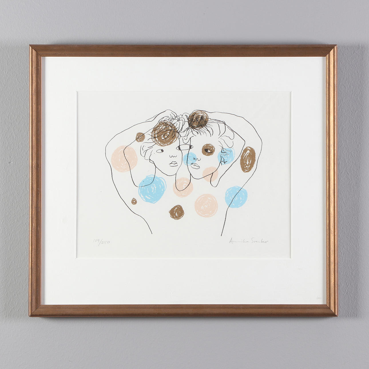 ANNIKA SVENBRO. Lithography, 109/250. Composition with two-headed figure. Signed.
