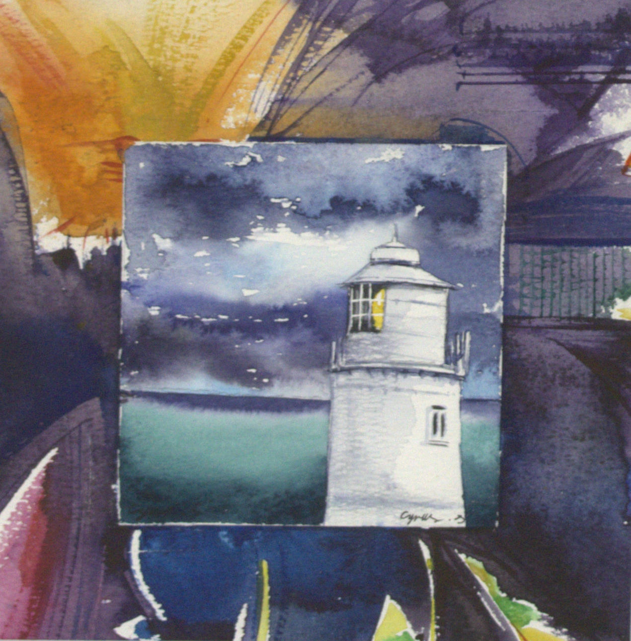 CYRUS SAFINIA. Watercolor, composition with lighthouse, signed.