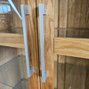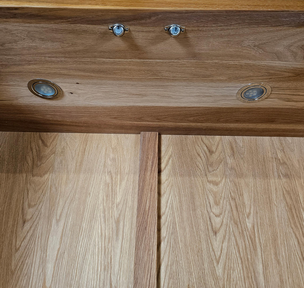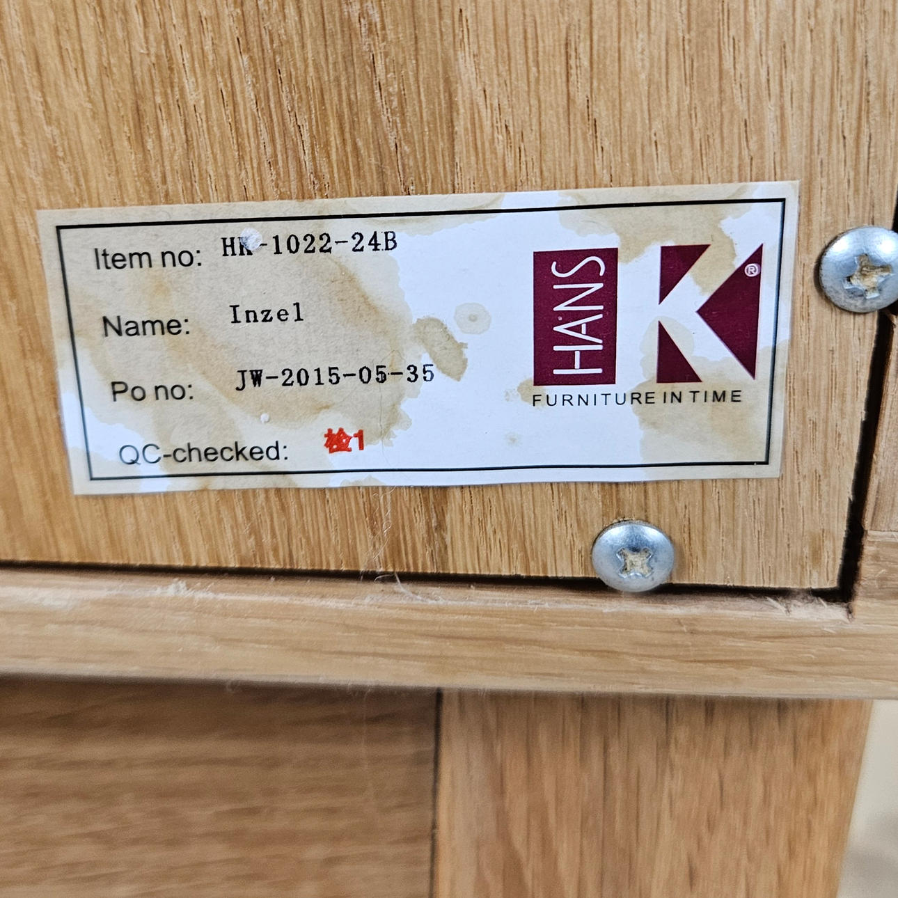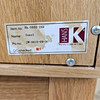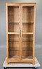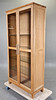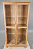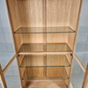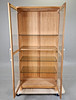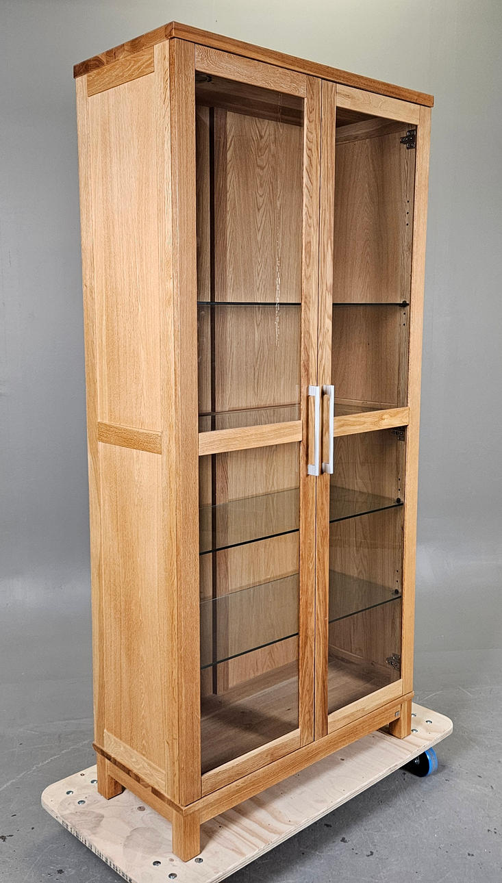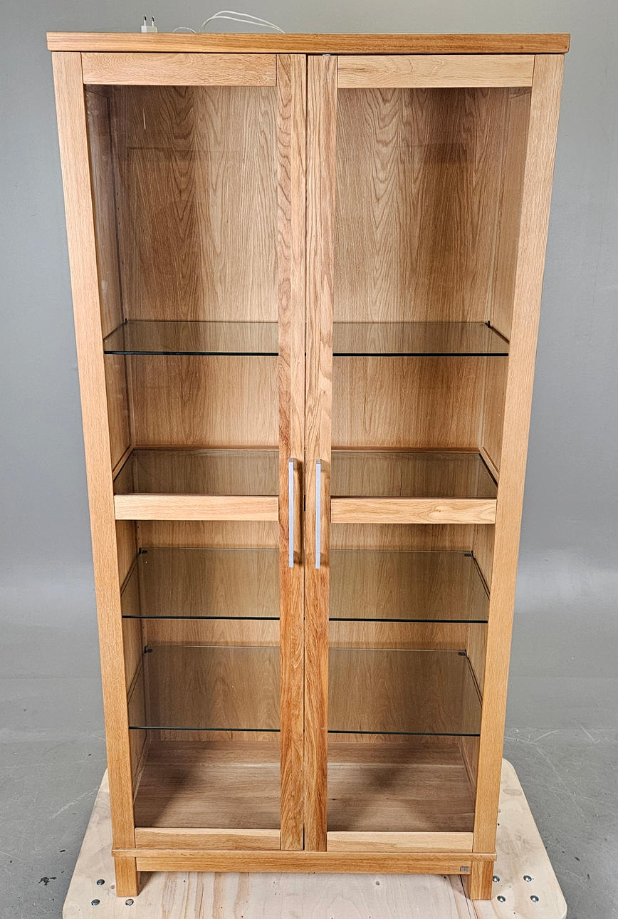 Oak, glass shelves, metal handles, label marked. Length approx. 90, width 41, height 190 cm.