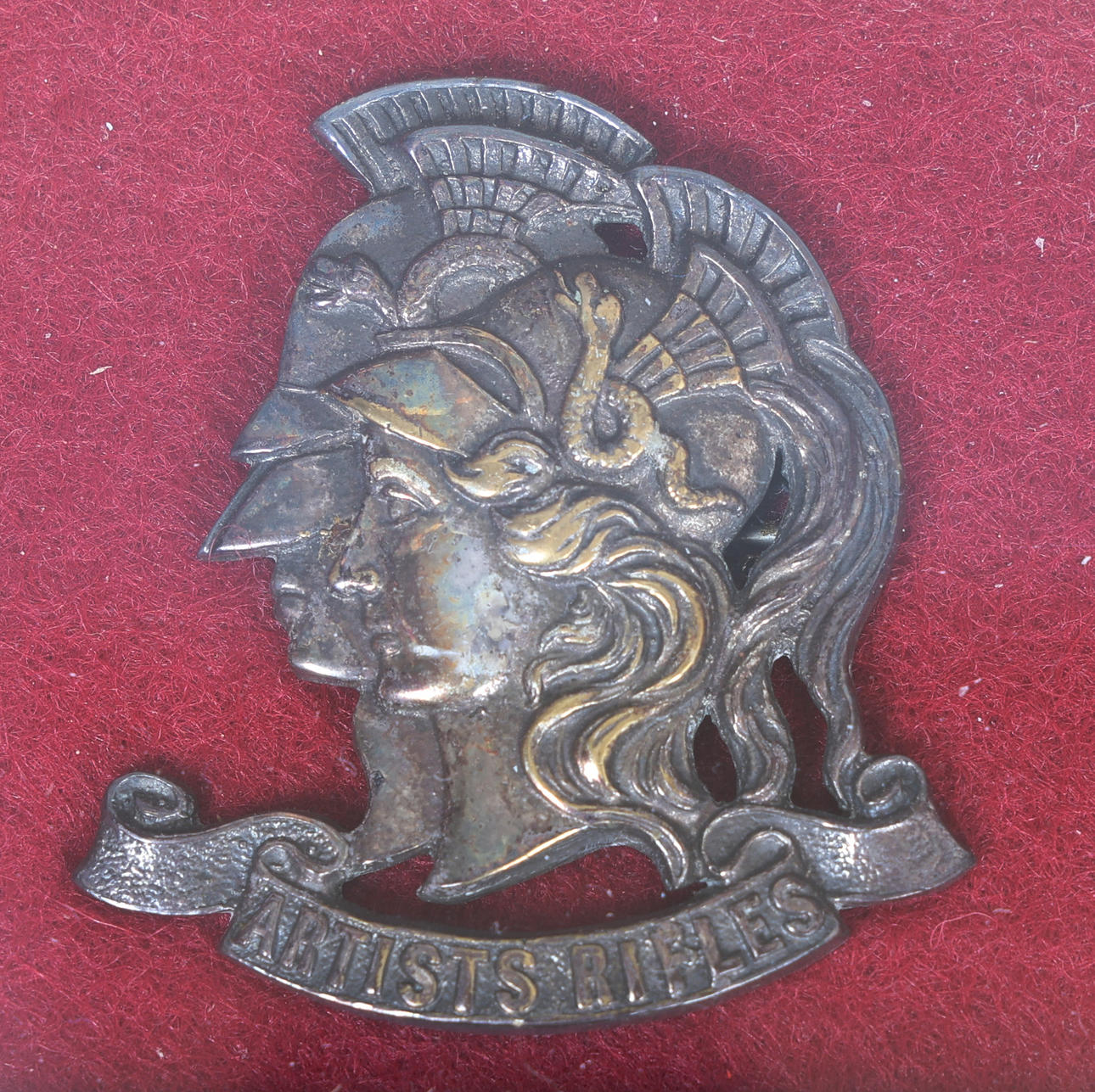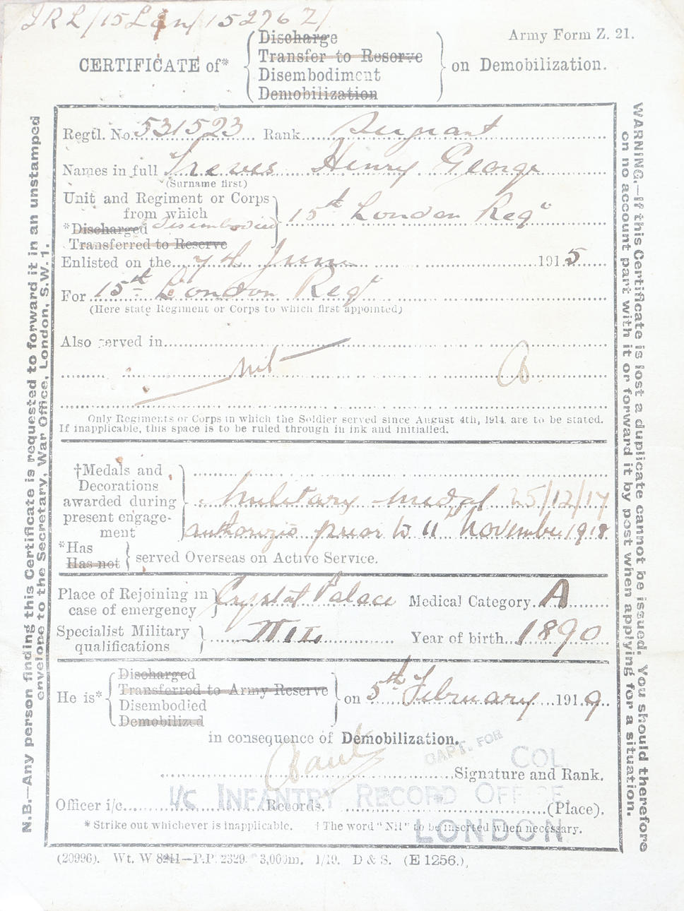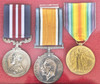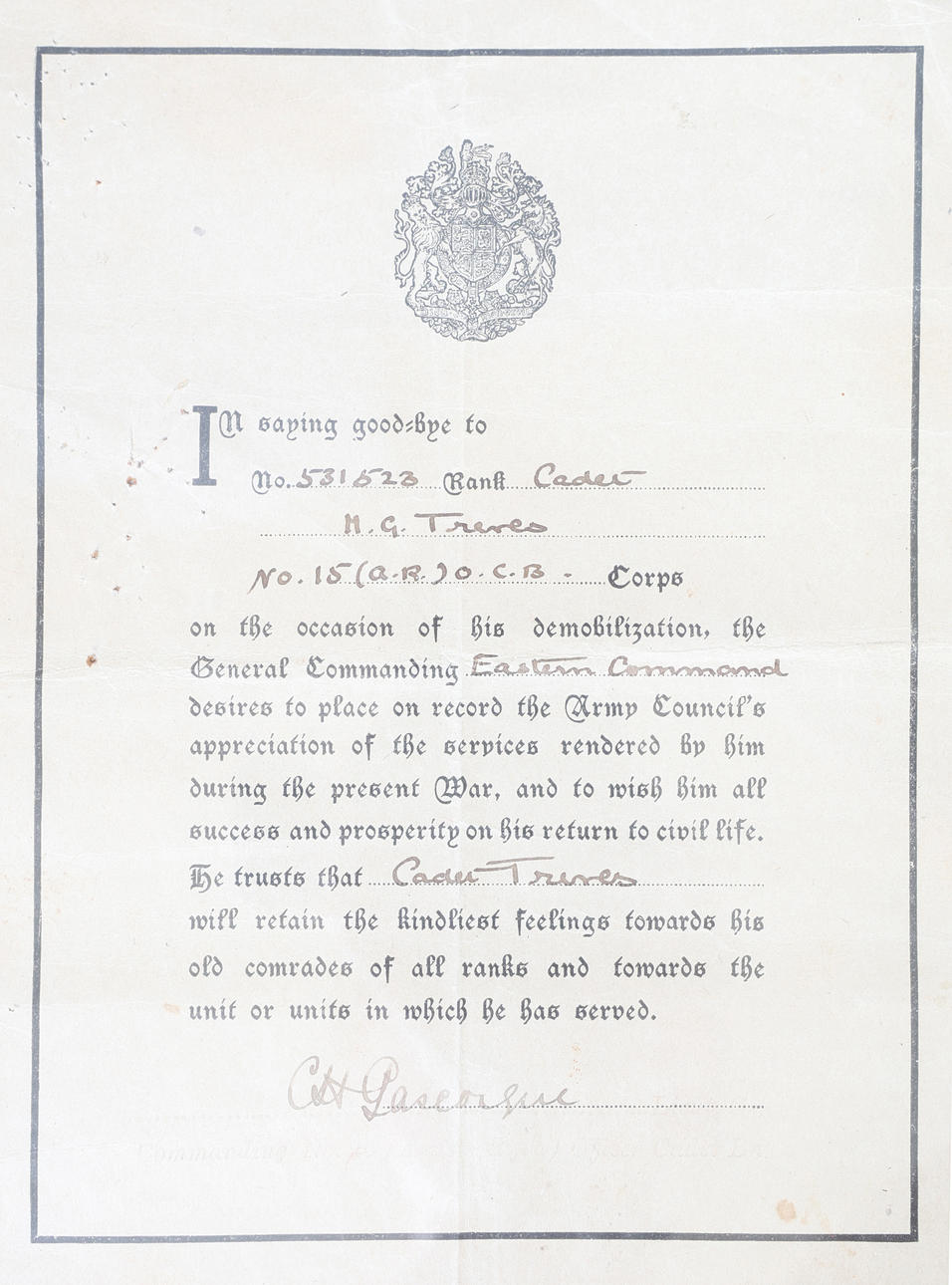 First World War grouping including Military Medal (unnamed copy), 1914-1918 British War Medal and Victory Medal (3953 SJT. H.G. TREVES 15-LOND. R.), Certificate of Disembodiment to 531523 Sergeant Henry George Treves, 15th London Regiment, Army Council Letter of Appreciation to 531523 Cadet H.G. Treves of No.15 O.C.B. (Officer Cadet Battalion), cap badge to the 28th Battalion London Regiment (Artists Rifles, all held in a glazed frame 46 cm x 36 cm, records show Henry George Treves, born 1890 Bermondsey, London, enlisted in the army on 7th June 1915, awarded the Military Medal on 25th December 1917, joined 15th Officer Cadet Battalion at Romford 7th June 1918 with the regimental number 531523, entitled to the BWM and Victory Medal, disembodied 5th February 1919.