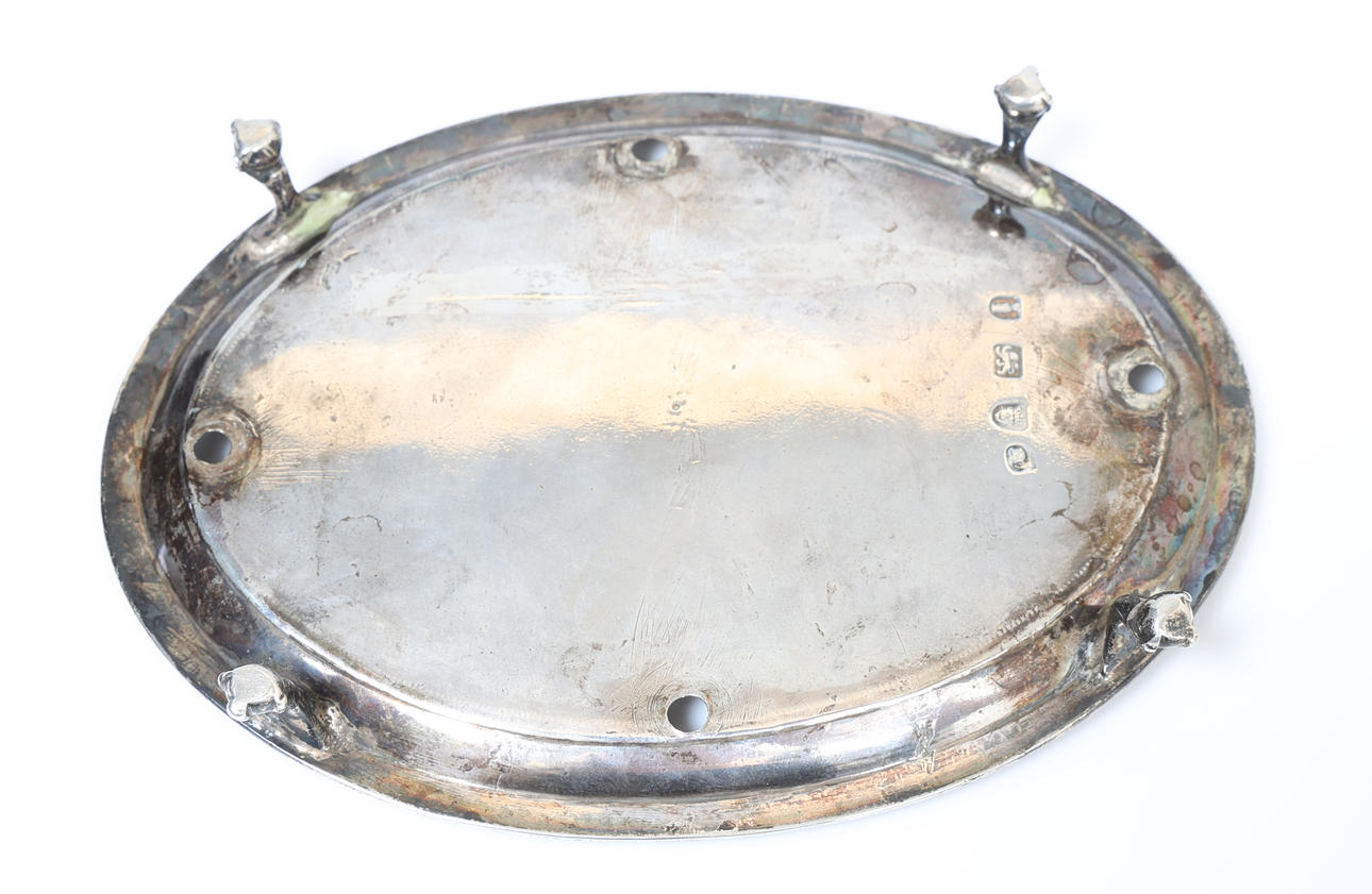 Four holes have been drilled to the dish near the rim, rubbing to hallmarks, surface tarnishing and marks.