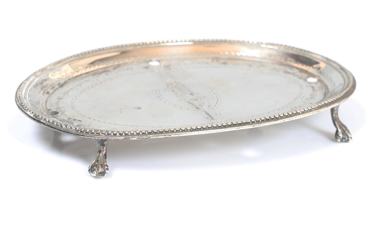 London 1784, maker John Lambe, of oval form with beaded rim and central shield shaped cartouche, raised on four claw and ball cast feet, 15.5cm wide, 12cm deep, 3.7oz.
