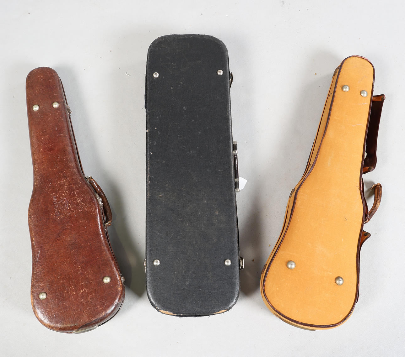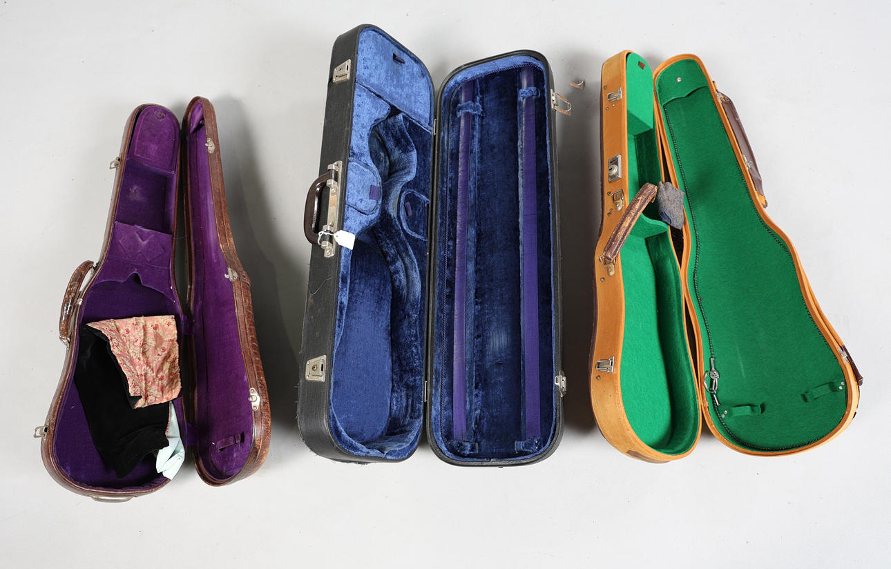 To include a black case with blue interior, an American made leather example with purple interior and a tan example, the largest measuring 80cm x 25cm x 10cm. (3).
