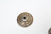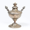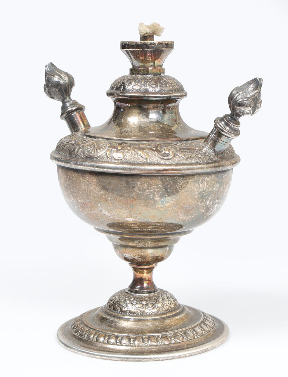 Modelled as an urn with central wick flanked by two tapers with acanthus leaf cast terminals, raised on a scale and beaded foot, 14cm high.