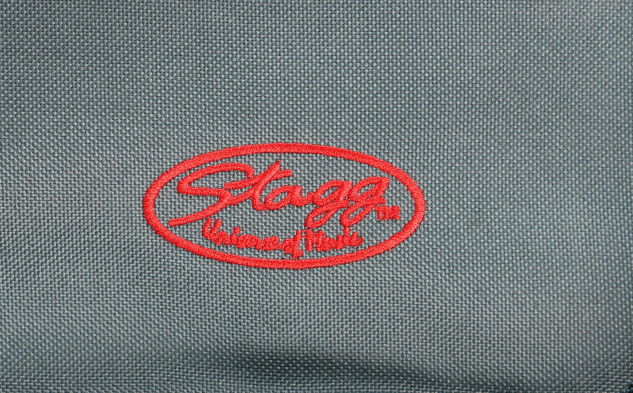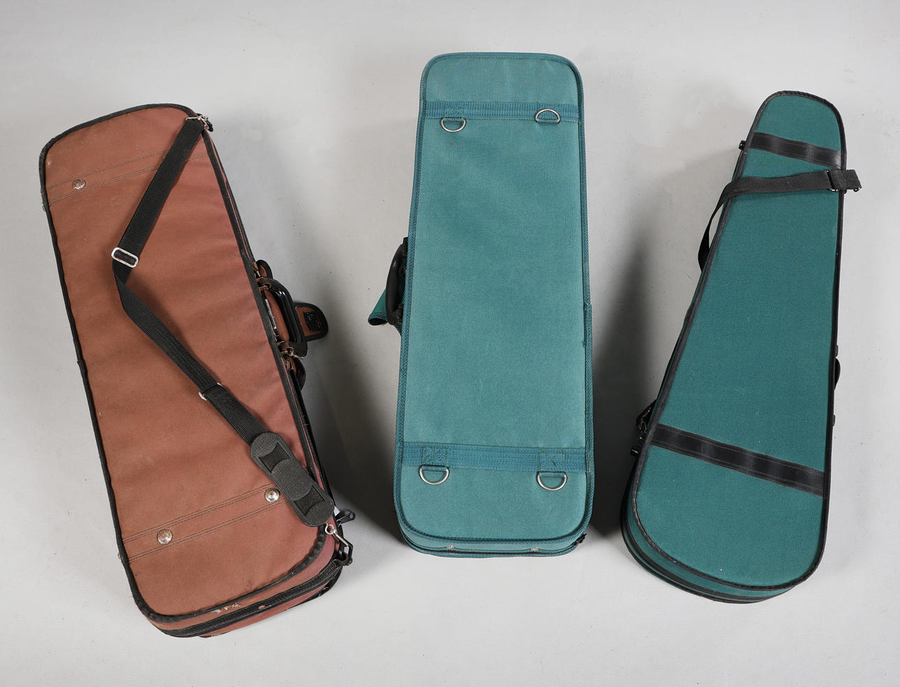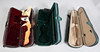To include a brown and two green cases including a Stagg example, one including an unmarked bow, largest case measuring 79cm x 26cm x 16cm. (3).