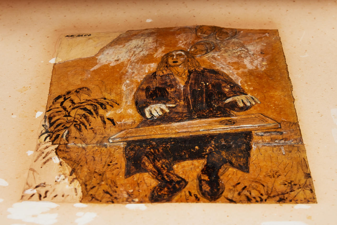 Pencil, marker, gouache on joined pieces of paper pasted on cardboard, 22 x 18 cm, including frame approx. 55 x 49 cm. Signed KR. RAUD in the upper left corner and monogram K. R. in the lower right corner. Approx. 1914—1943.