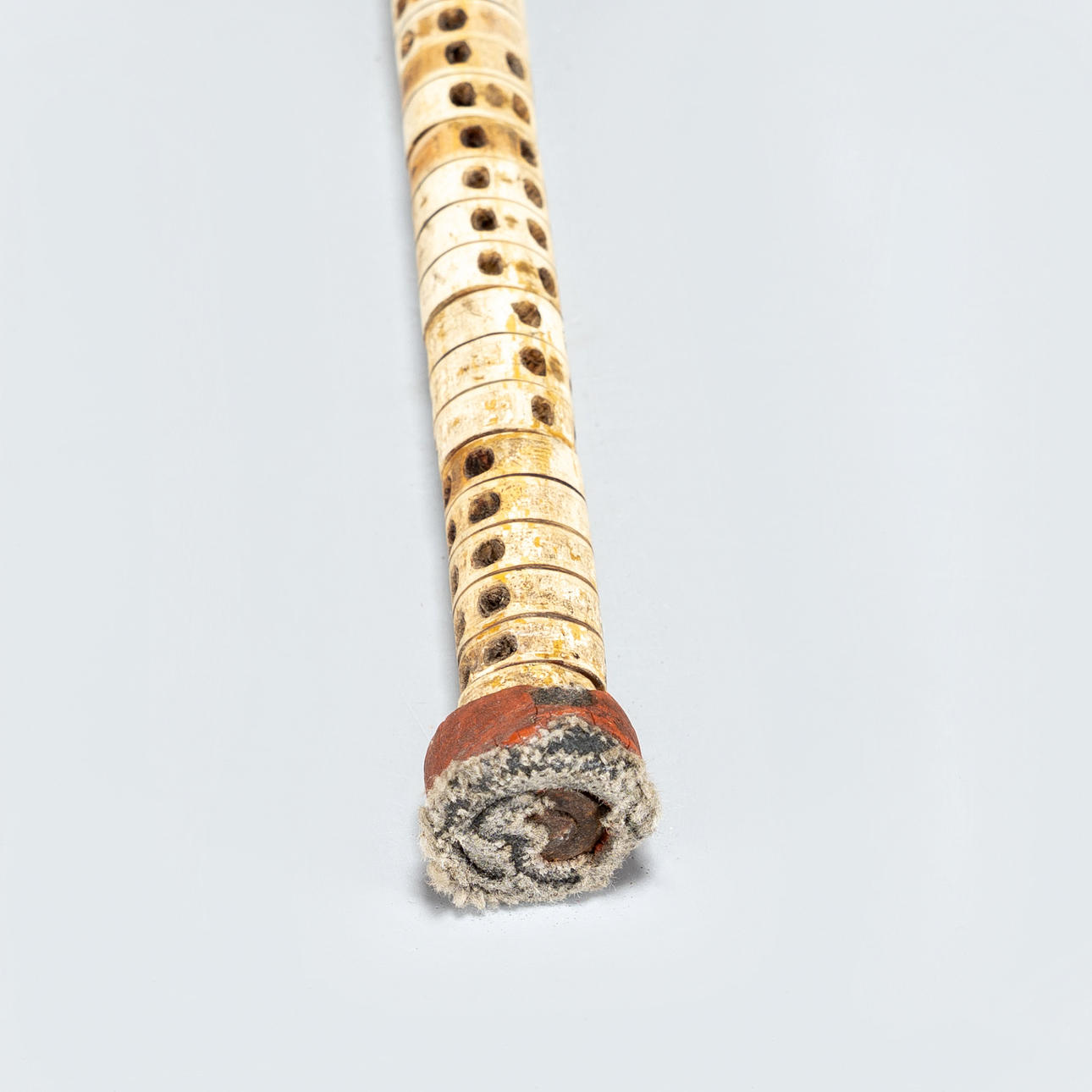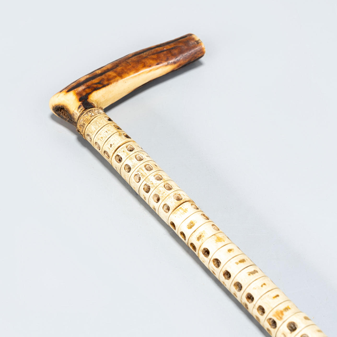 Stick adorned with vertebrae from shark. Handles made of horns.