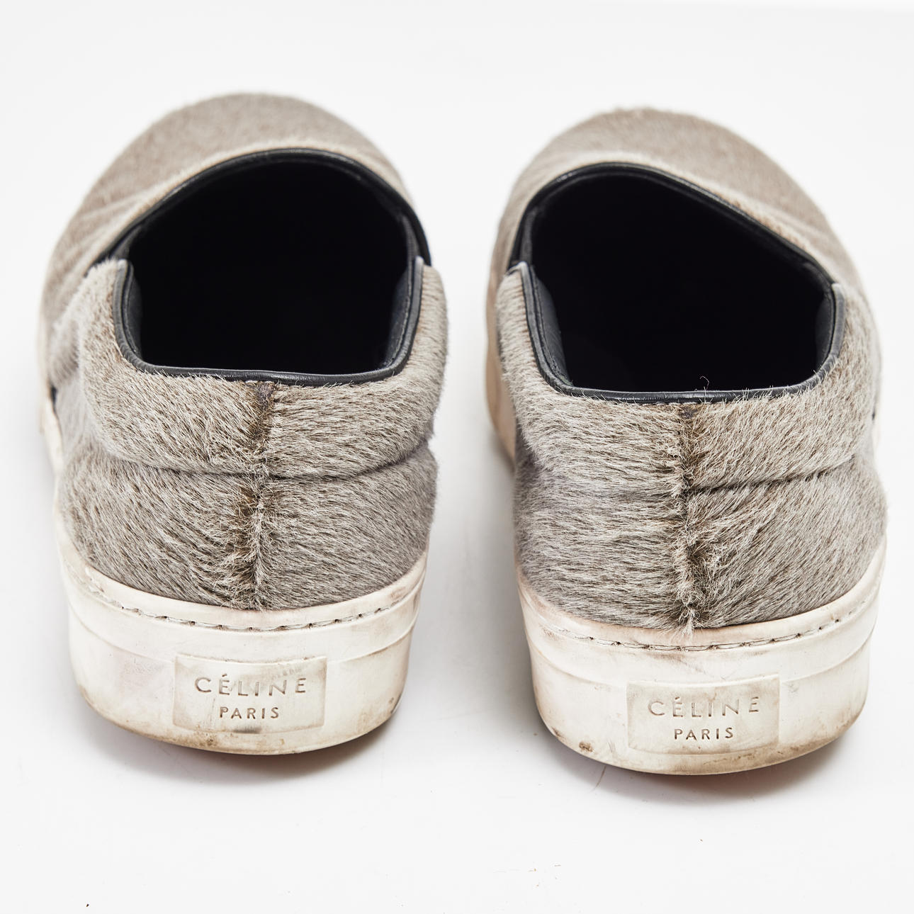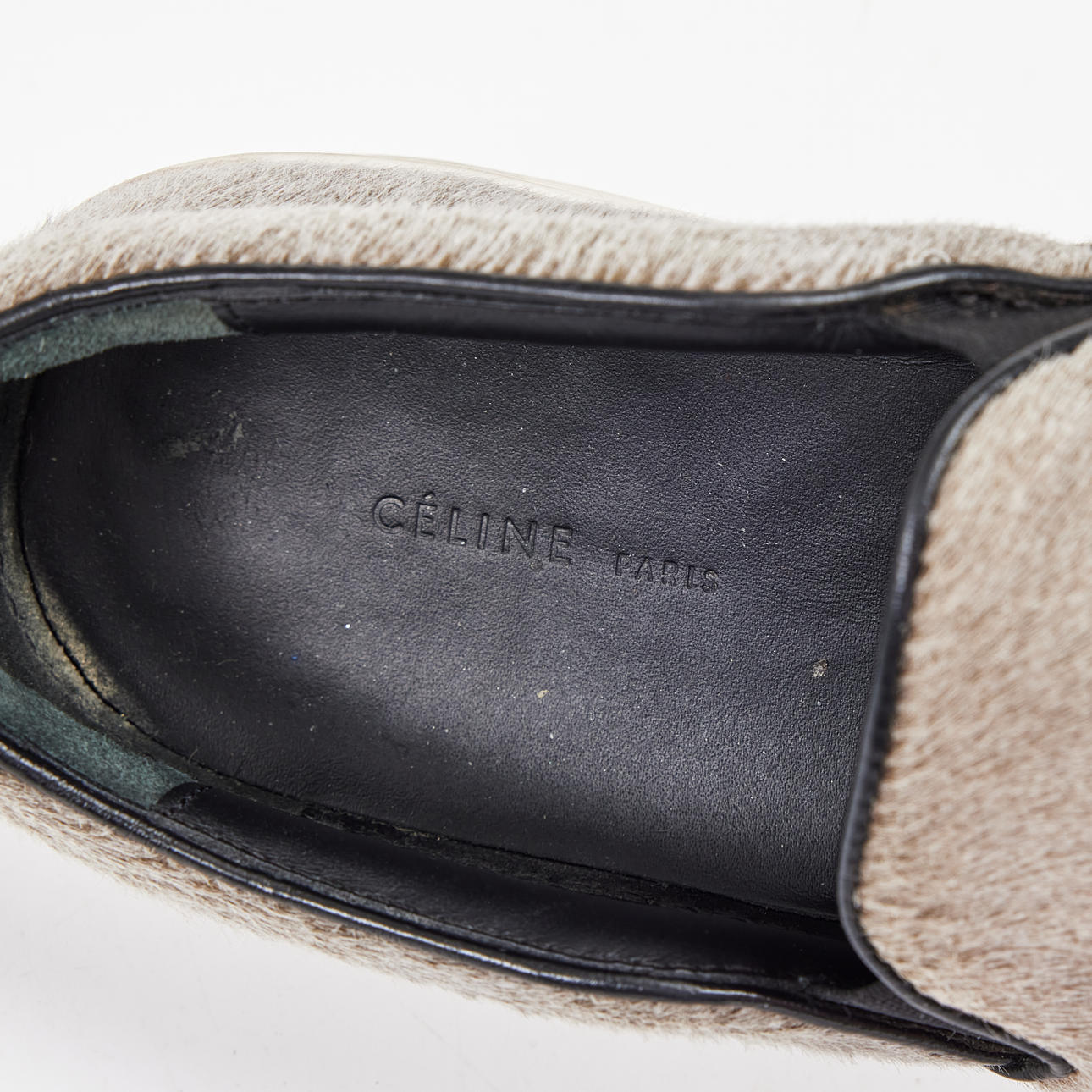 In grey pony hair- calfskin, white sole, back marked “Céline Paris”, shoe bag included, marked size 36, length approx. 25, height 8 cm.