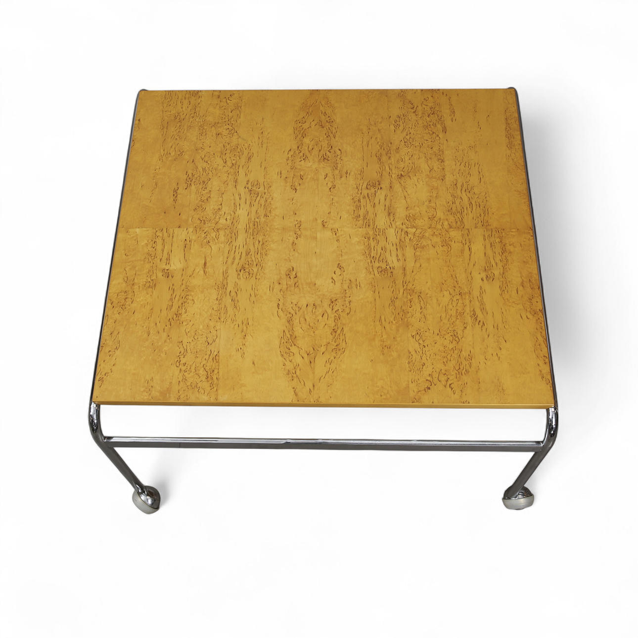 Chromed steel frame, board veneered with masur birch. On wheels. Labeled. Height 46 cm Disc 78x70 cm.