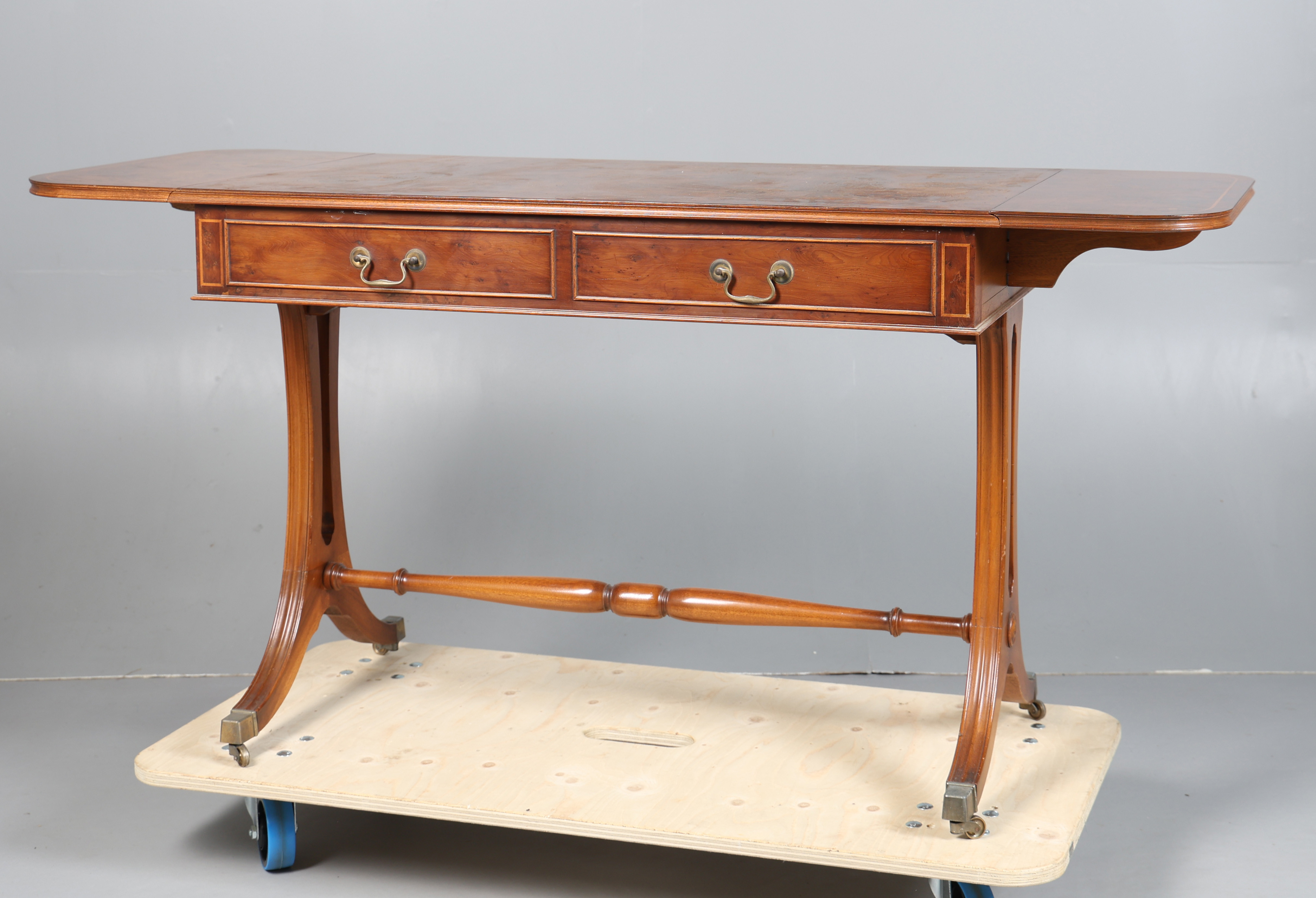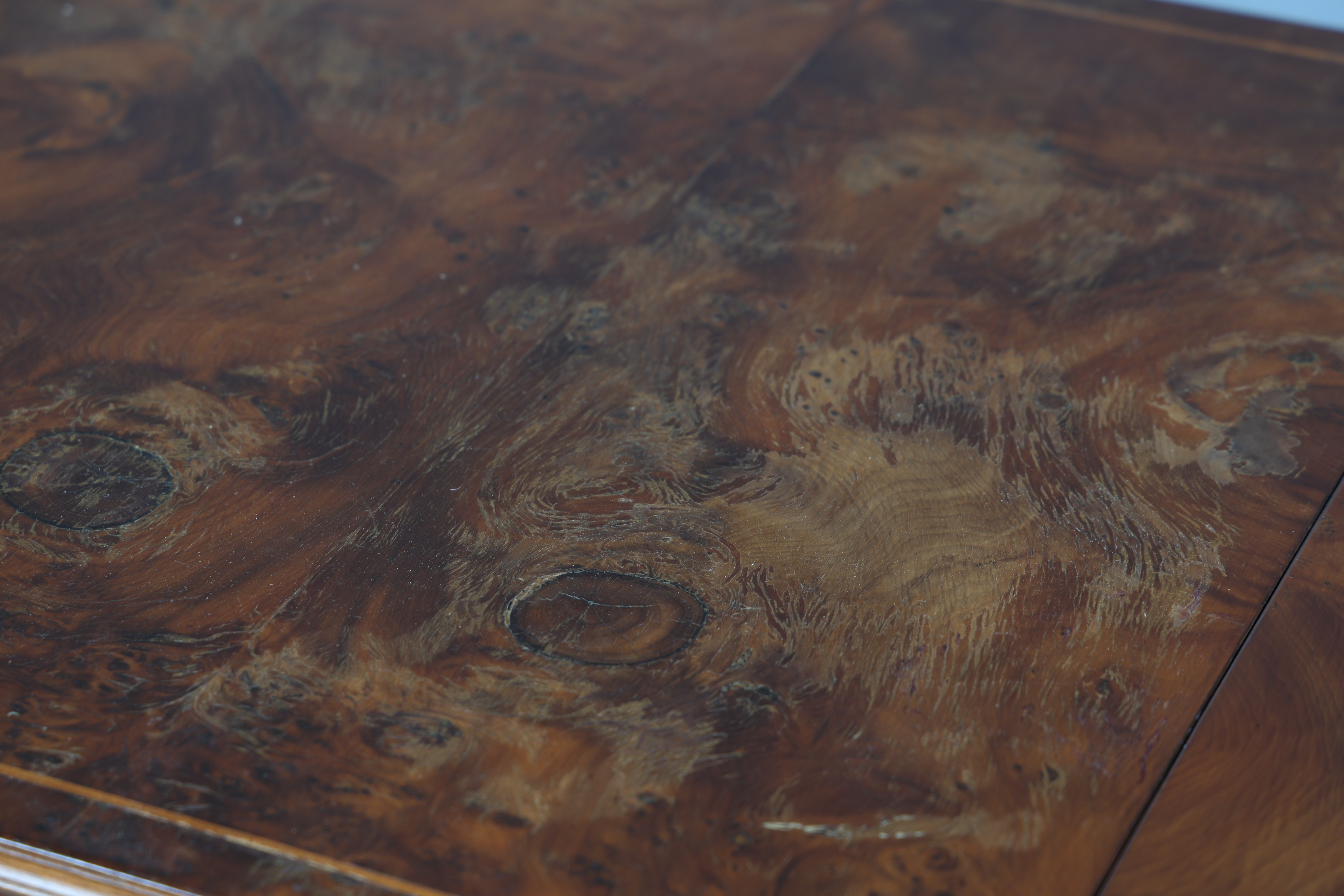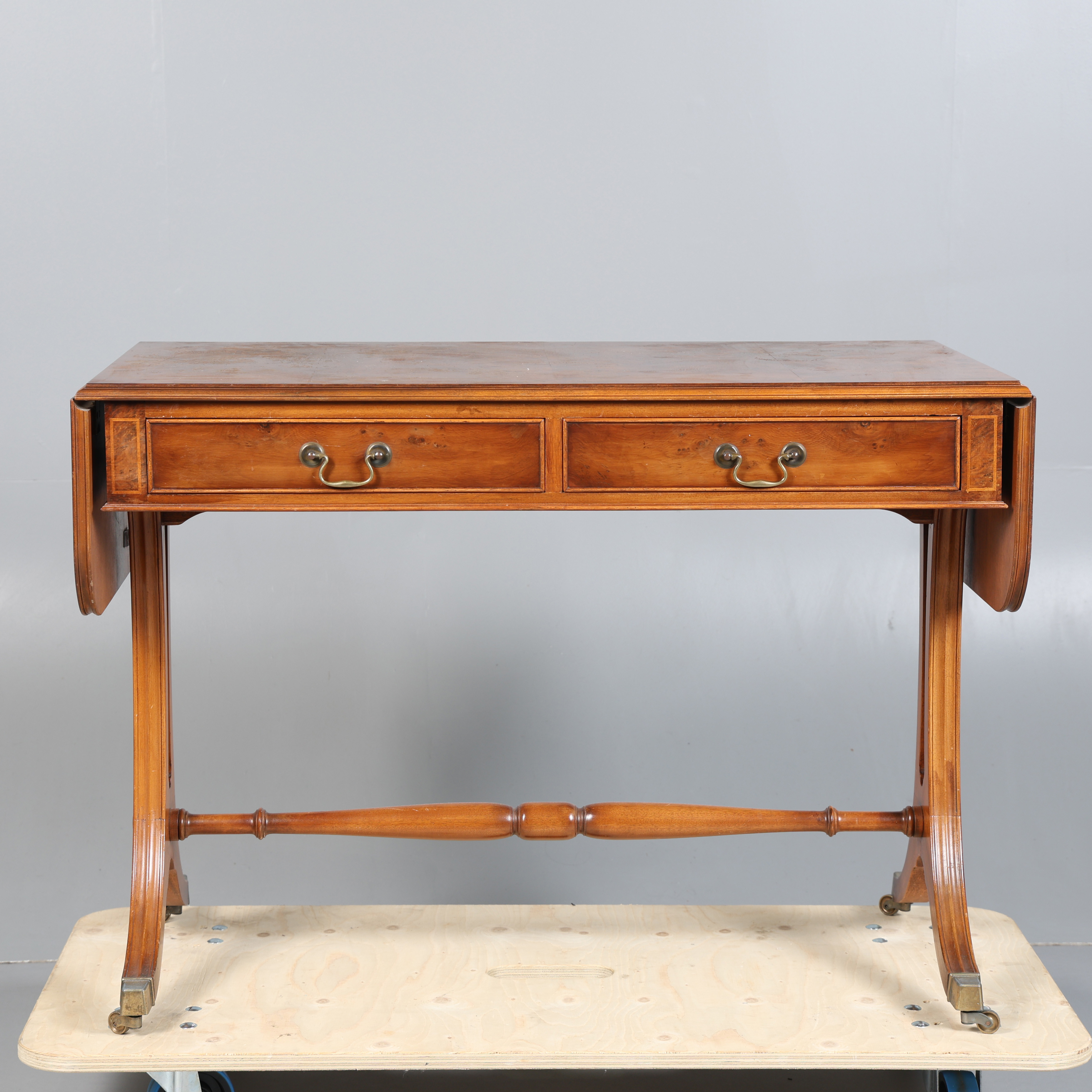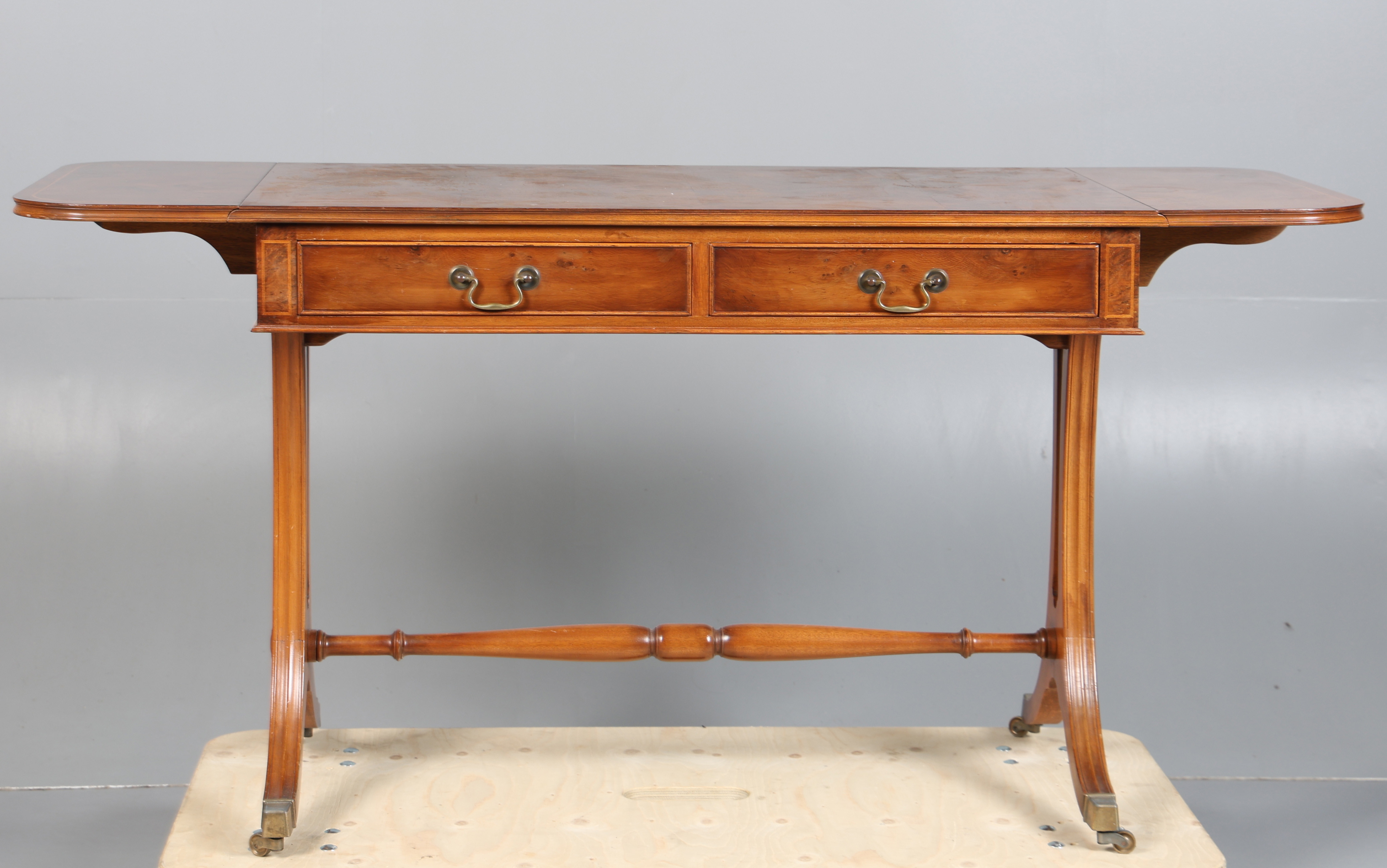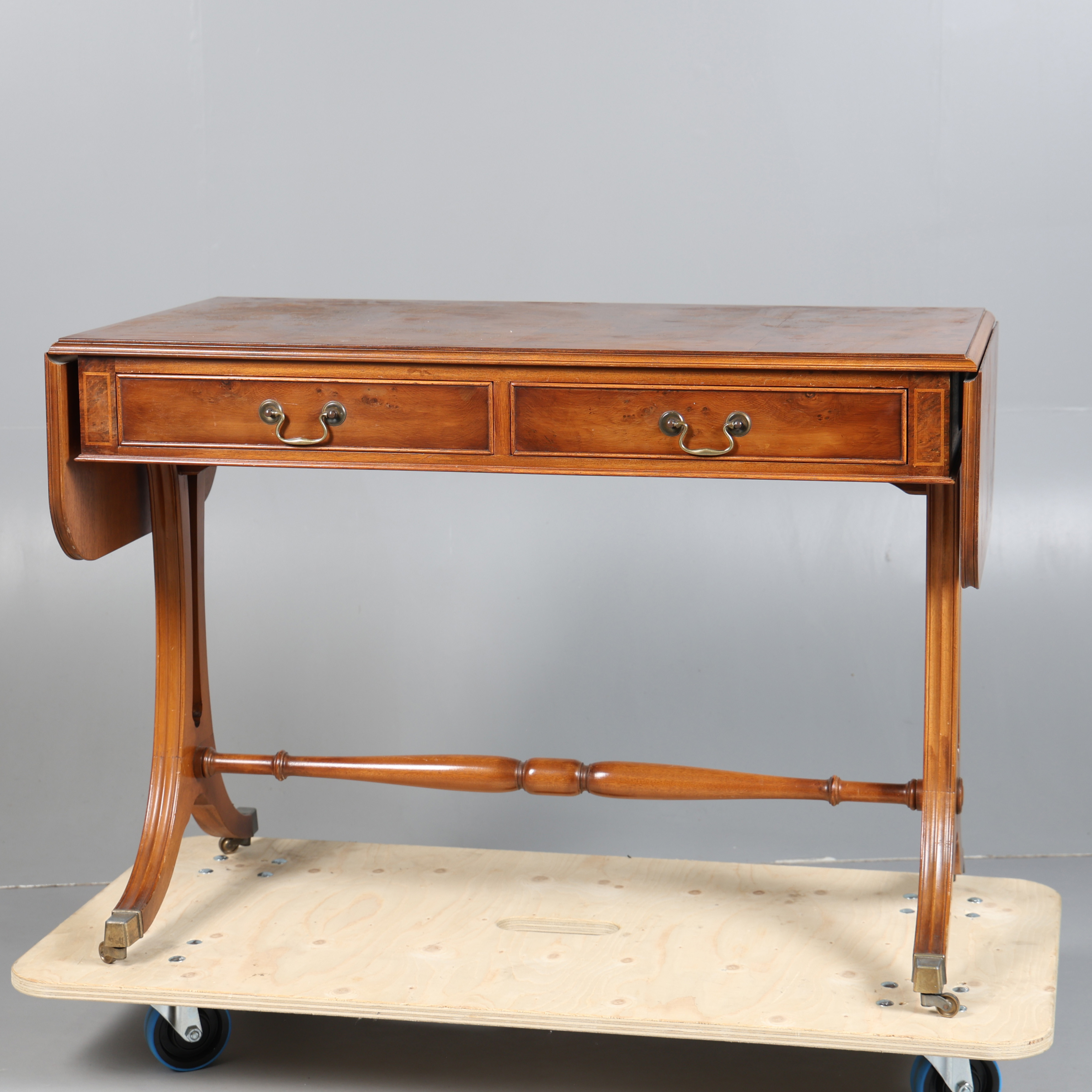 4366255. A 20TH CENTURY BURR WALNUT SOFA TABLE.