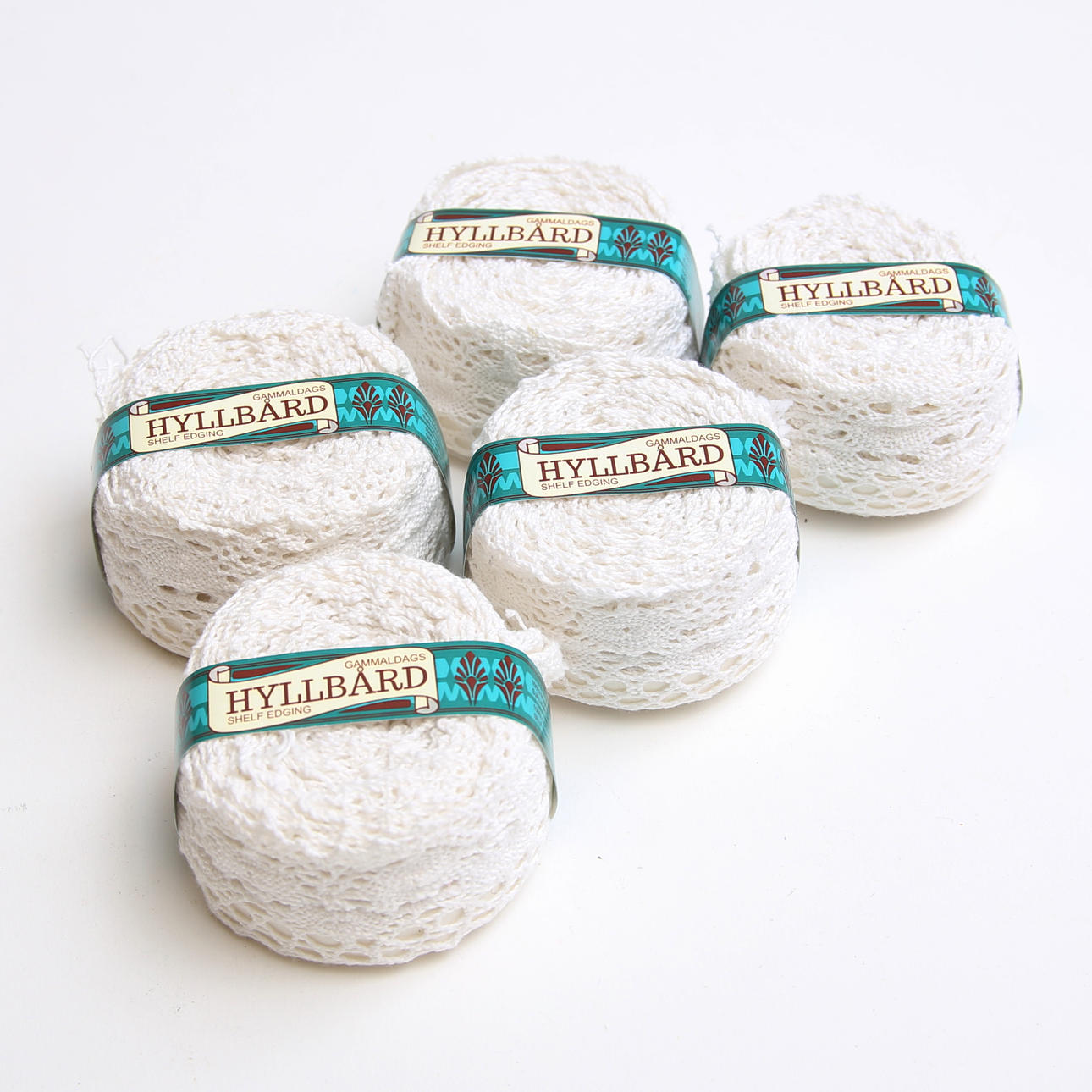 5 rolls shelf border, textile, a' 4 meters, width approx. 4 cm 7 rolls shelf strip a' 5 meters, width approx. 2 cm 17 rular shelf strip of 5 meters, width approx. 2.2 cm.