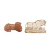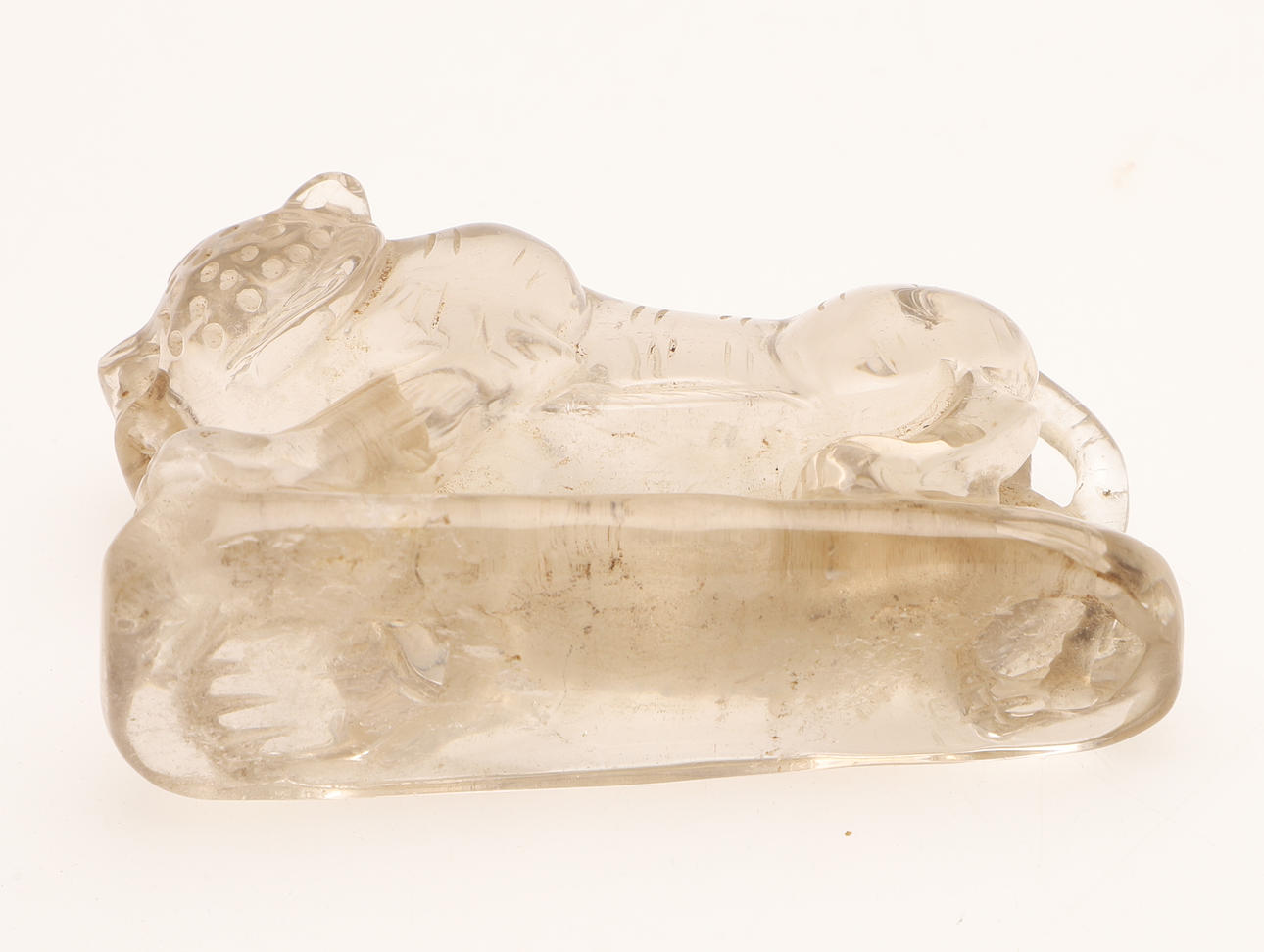 Including a rock crystal carved figure of a Tiger (7cms long), and a small carved soapstone figure of a buddhist lion with wax seal underneath (6cms long). (2).