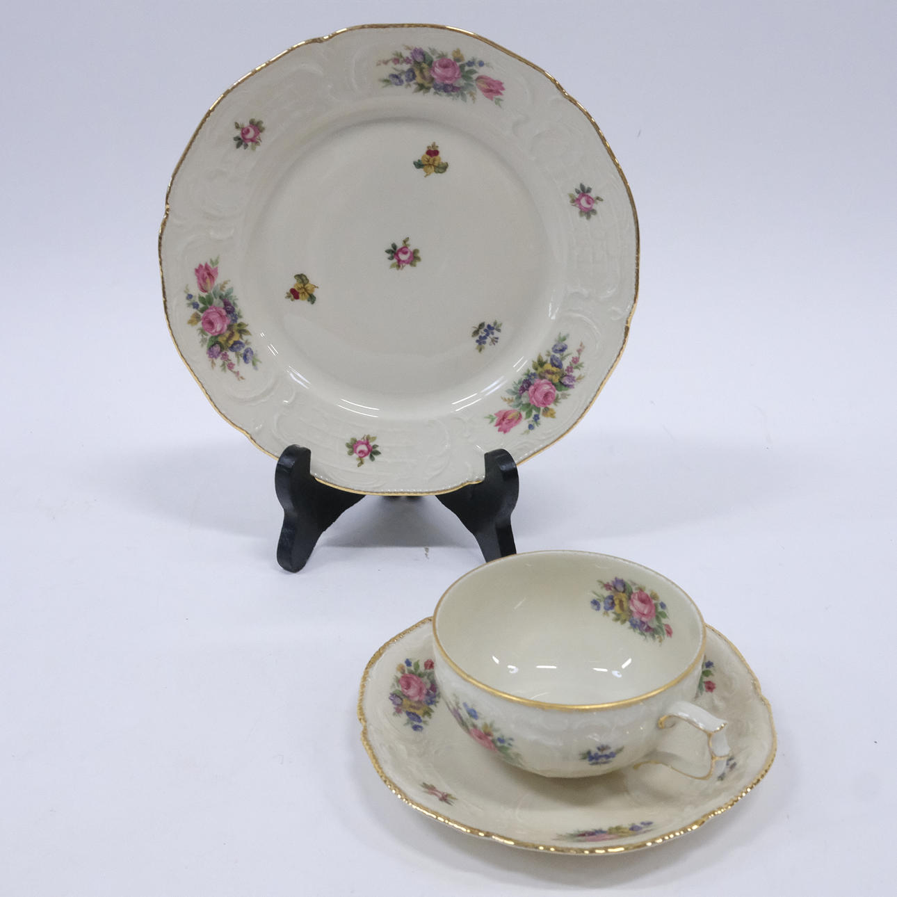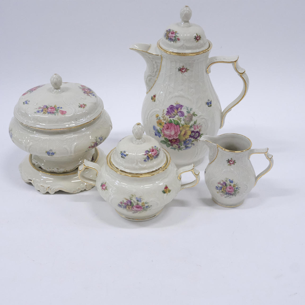 12 cups, 12 saucers, 12 side dishes, sugar bowl, cream jug, coffee pot+saucer and bowl with lid.