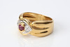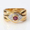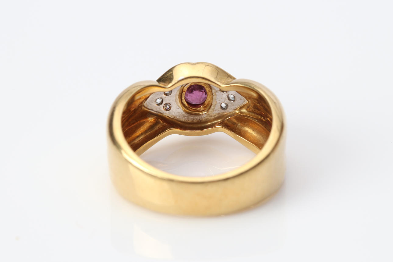 Gold ring 18k with a fracture treated ruby approx. 4 mm and smaller diamonds, size. ca. 17 mm, total weight 7,3 g.