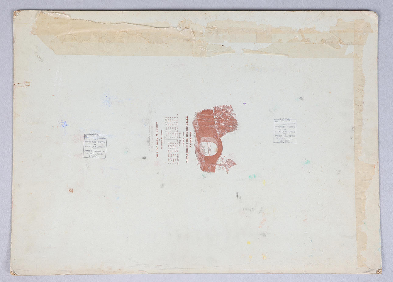 With marks and wear commensurate with age, moisture marks and scuffs to edges, the pasted on car design has losses causing an earlier attempt at the design to be visible.