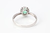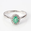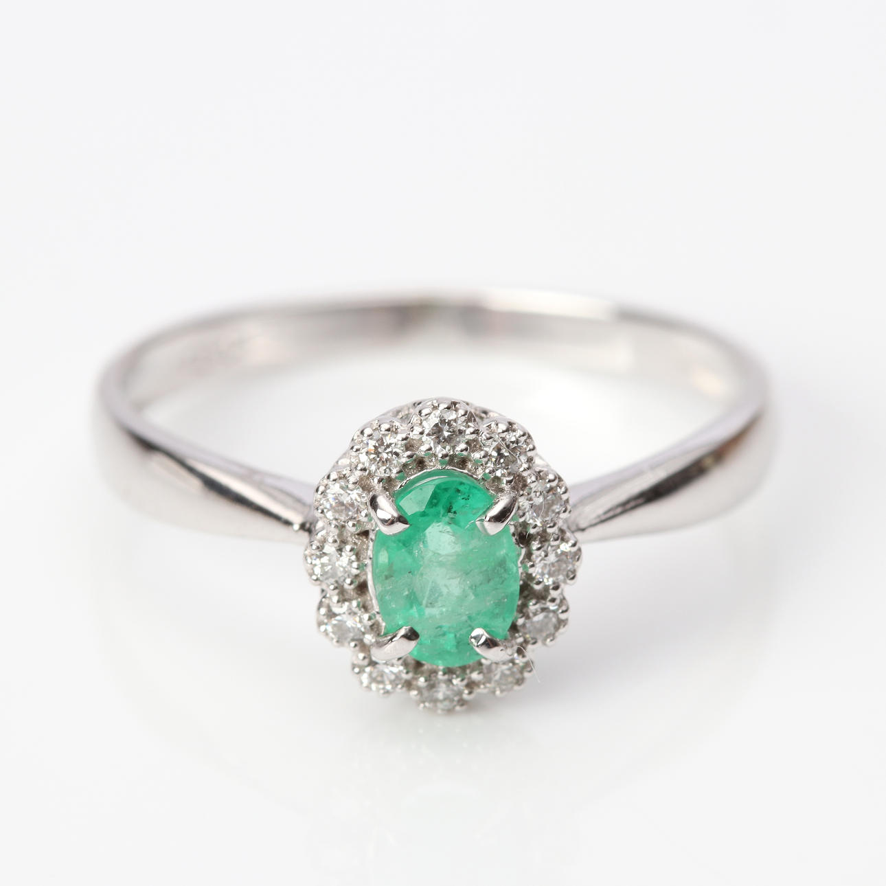 Ring in white gold 18k with a faceted emerald 5,6 x 4,0 mm and smaller diamonds approx. 0,10 ct, size. ca 17,5 mm, total weight 2,1 g.
