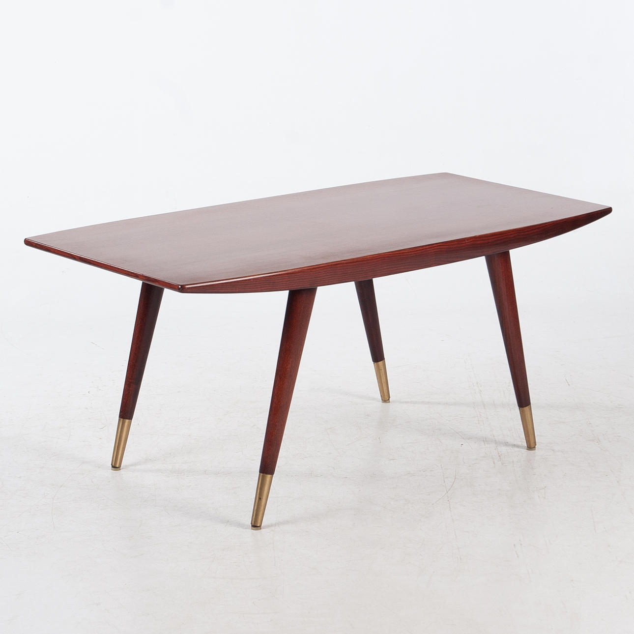 1950s/60s, rectangular board veneered with teak, undercarriage in pine. Rounded corners and turned, tapered legs with brass sleeves.