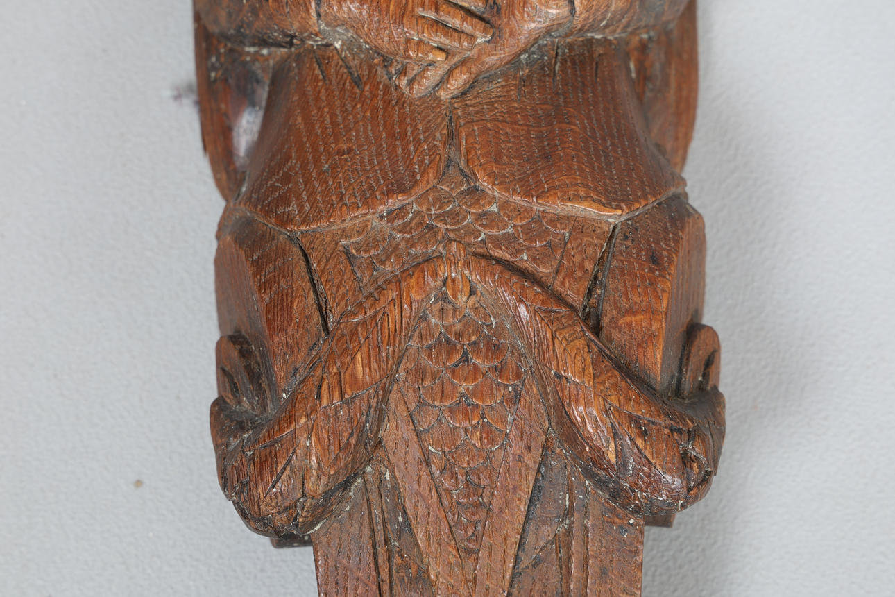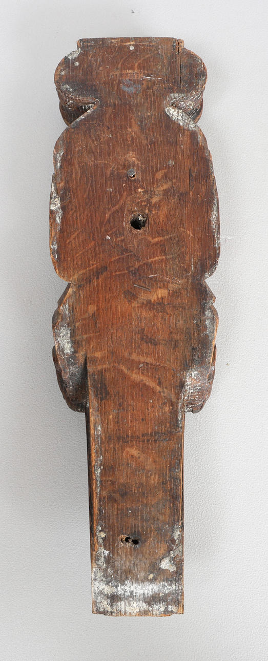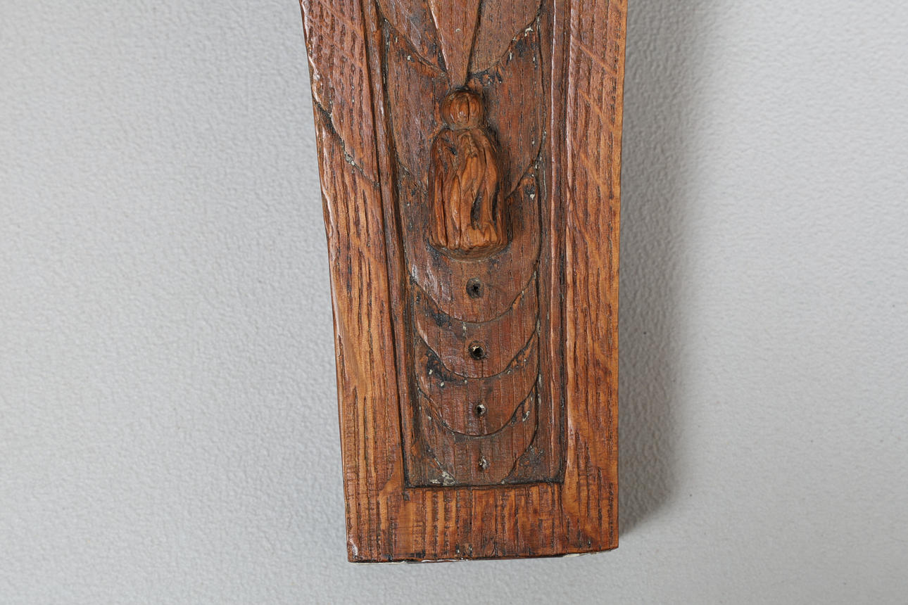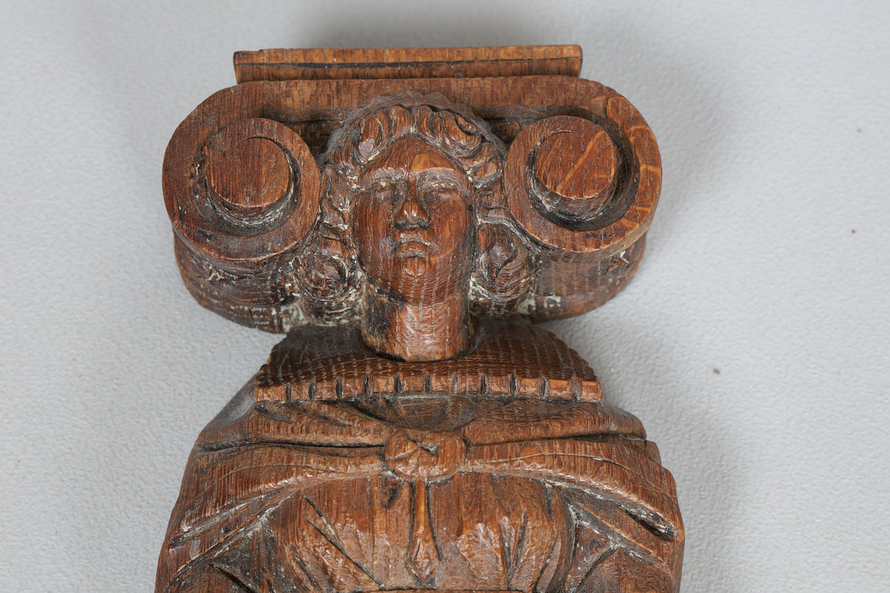Carved with an ionic capital above a carved saint, 42cm high 12cm wide.