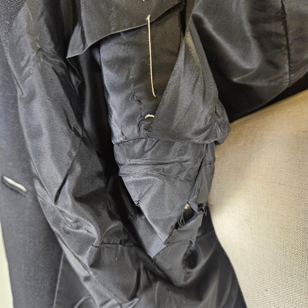 Lining with damage. Age-related fragility and wear. Minor holes/back injuries.