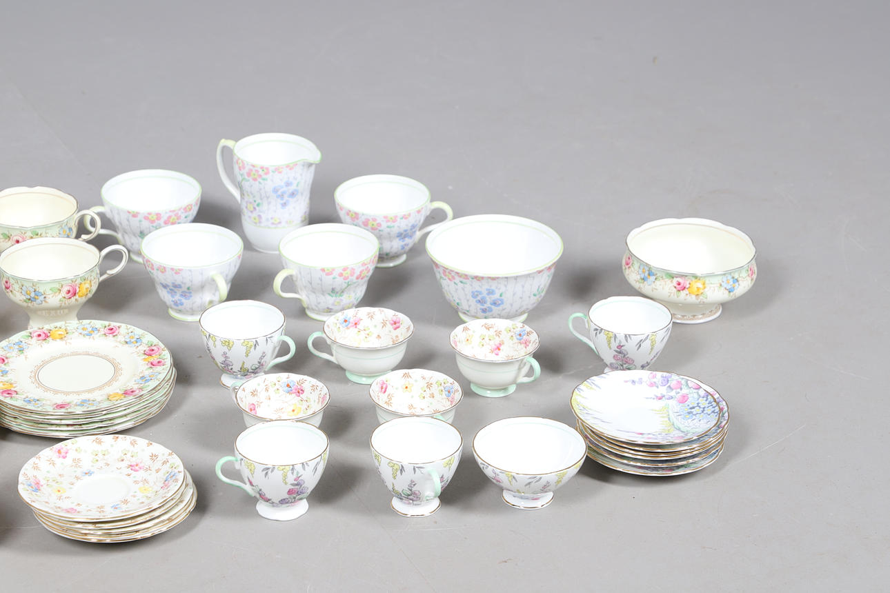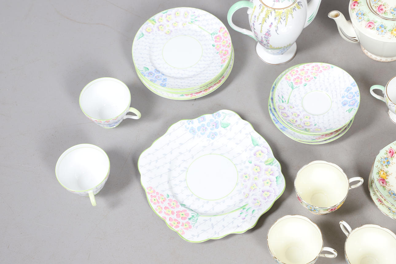 each six person setting, one with teapot, decorated with flowers; together with a Paragon teaset, six place setting comprising teapot, milk jug, sugar bowl, five large cups and saucers and five small cups and saucers.
