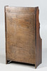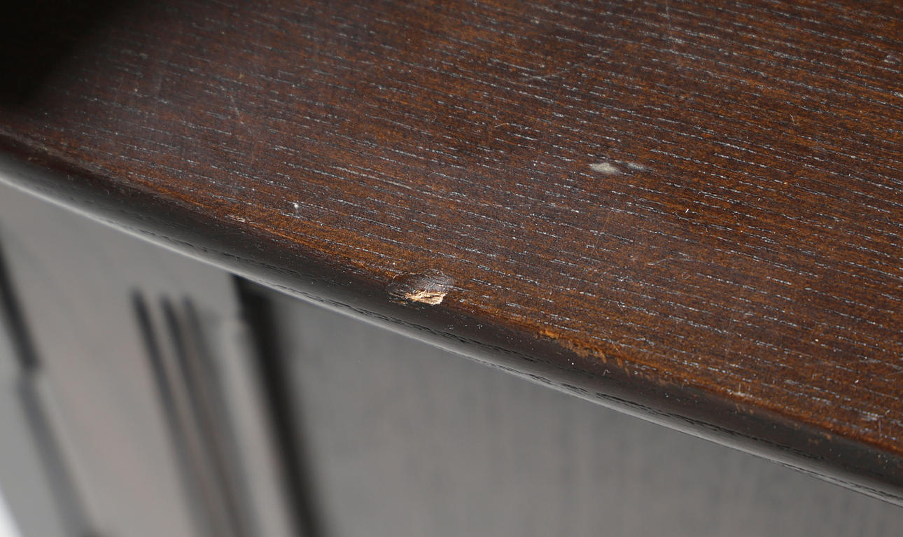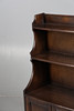 The dark elm waterfall bookcase with three shelves above two panelled cupboard doors, 111cm x 61cm x 33cm.