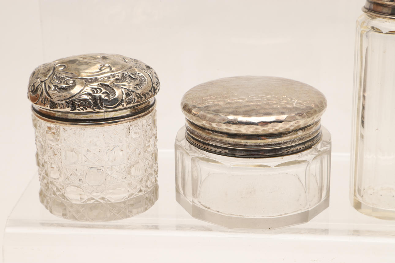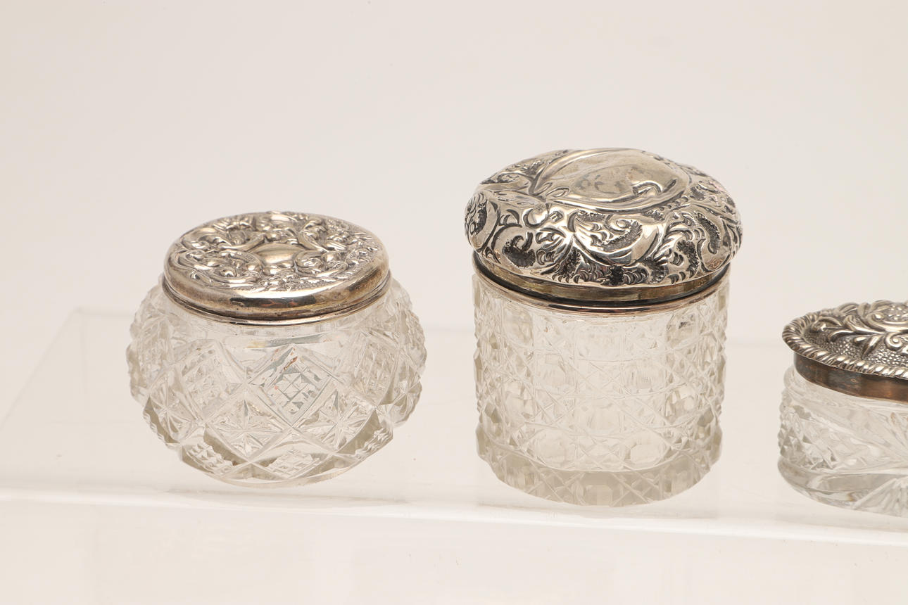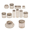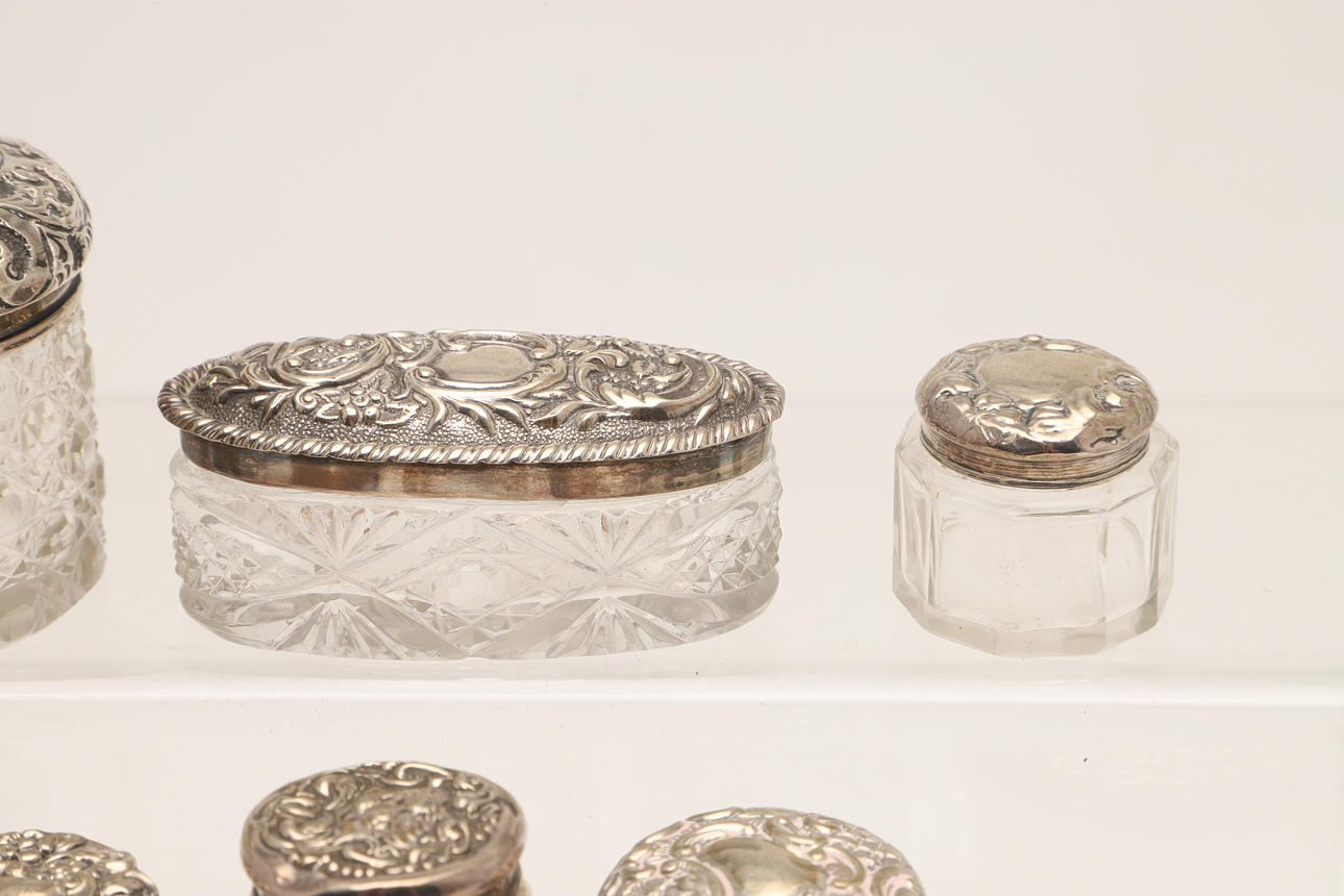 4369007. TWELVE SILVER TOPPED CUT GLASS JARS.
