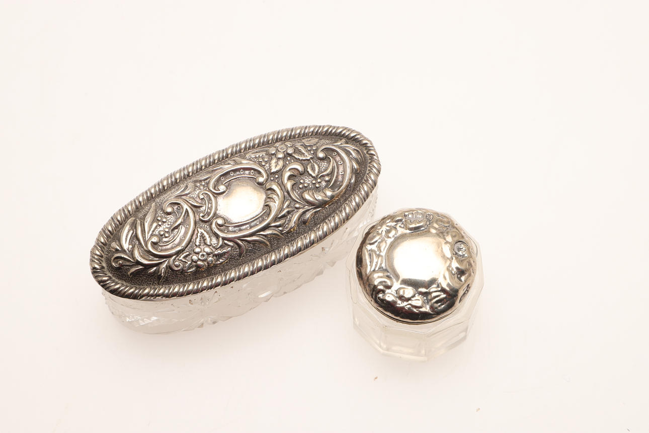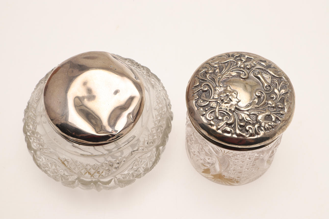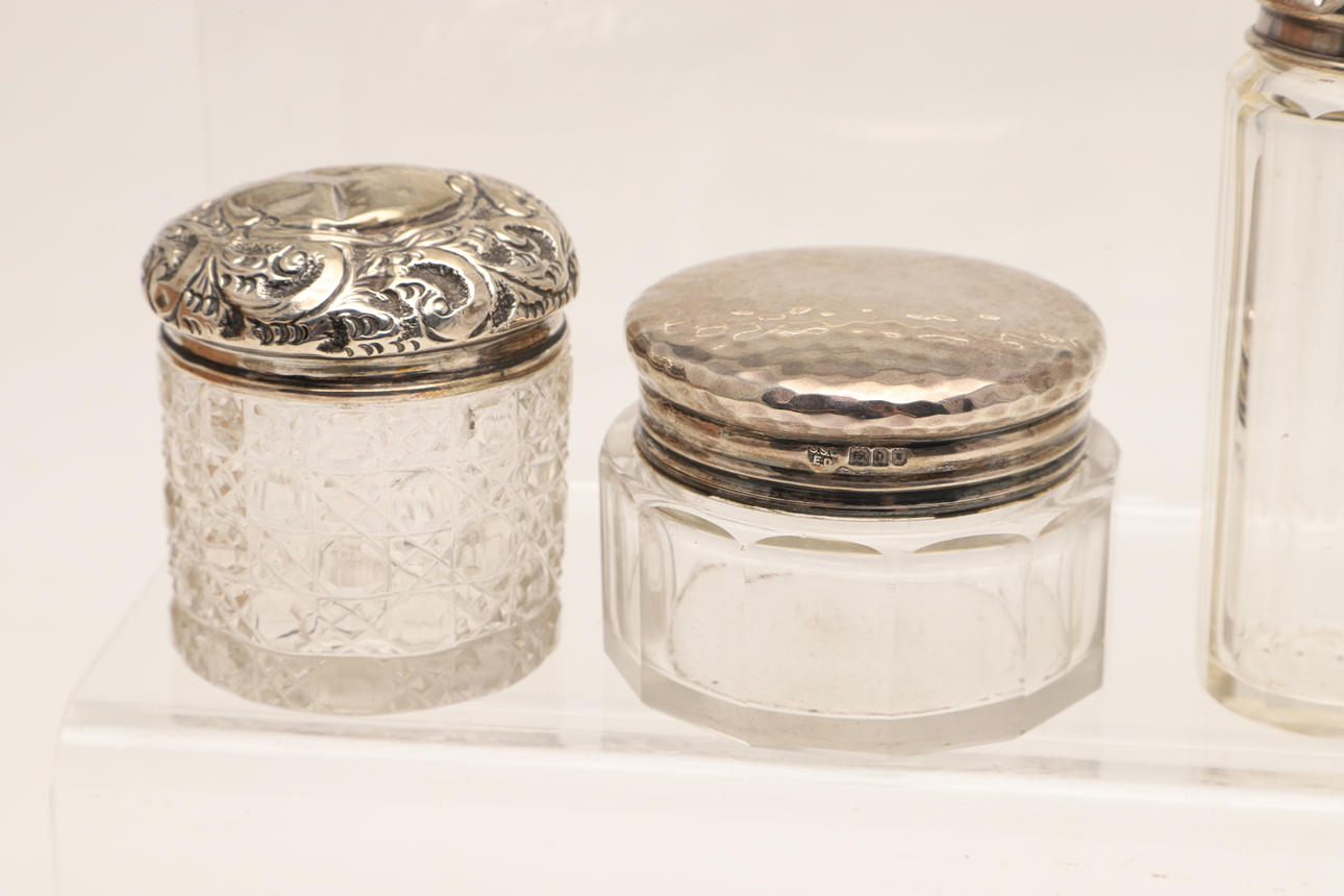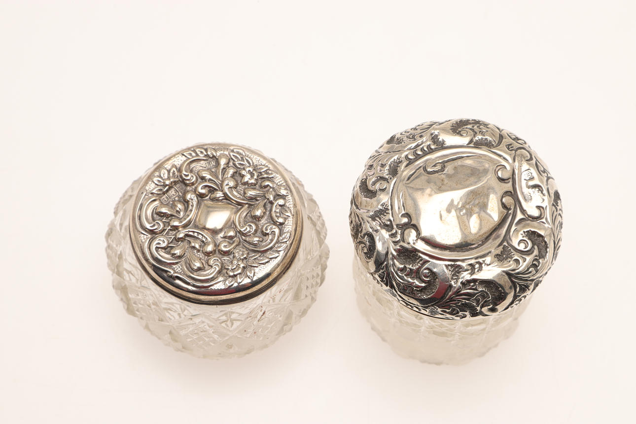 4369007. TWELVE SILVER TOPPED CUT GLASS JARS.
