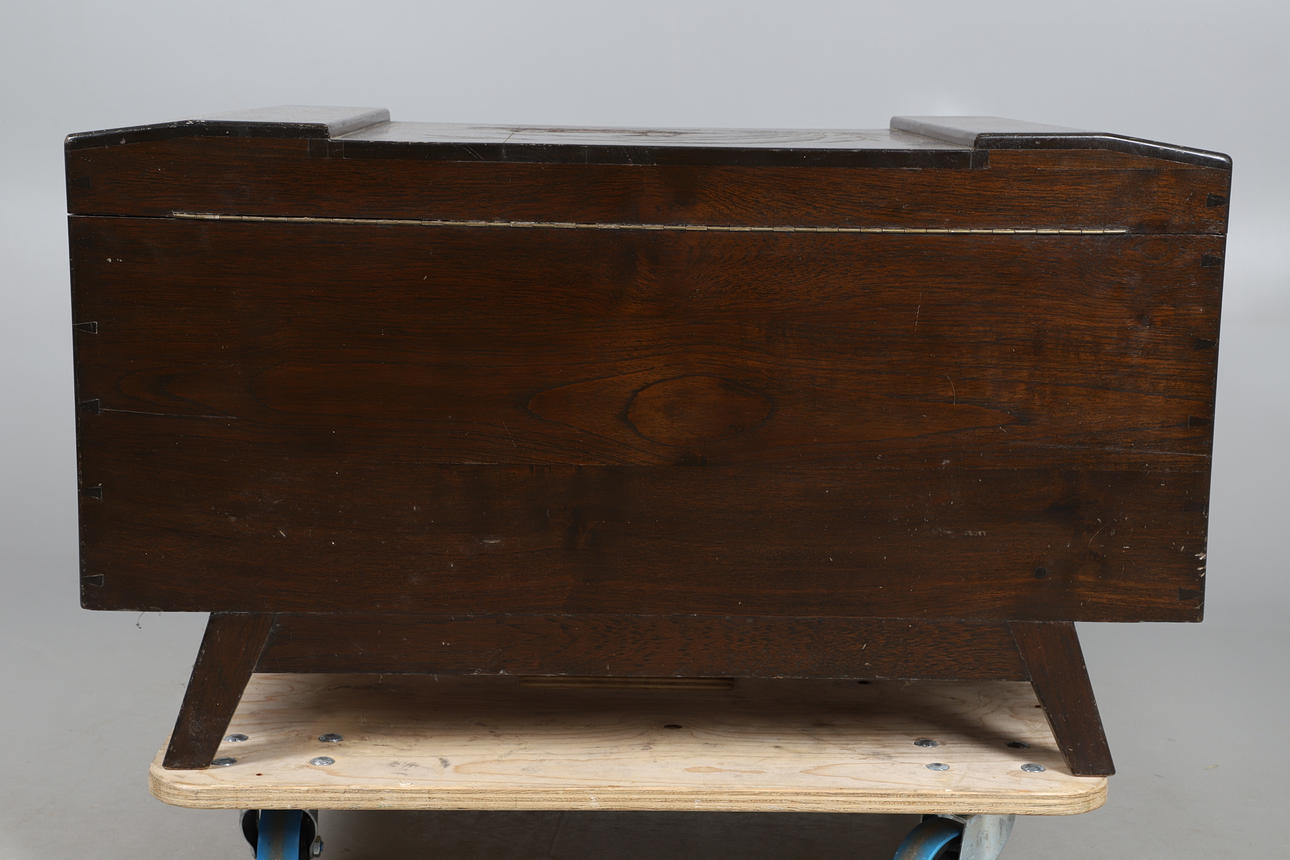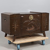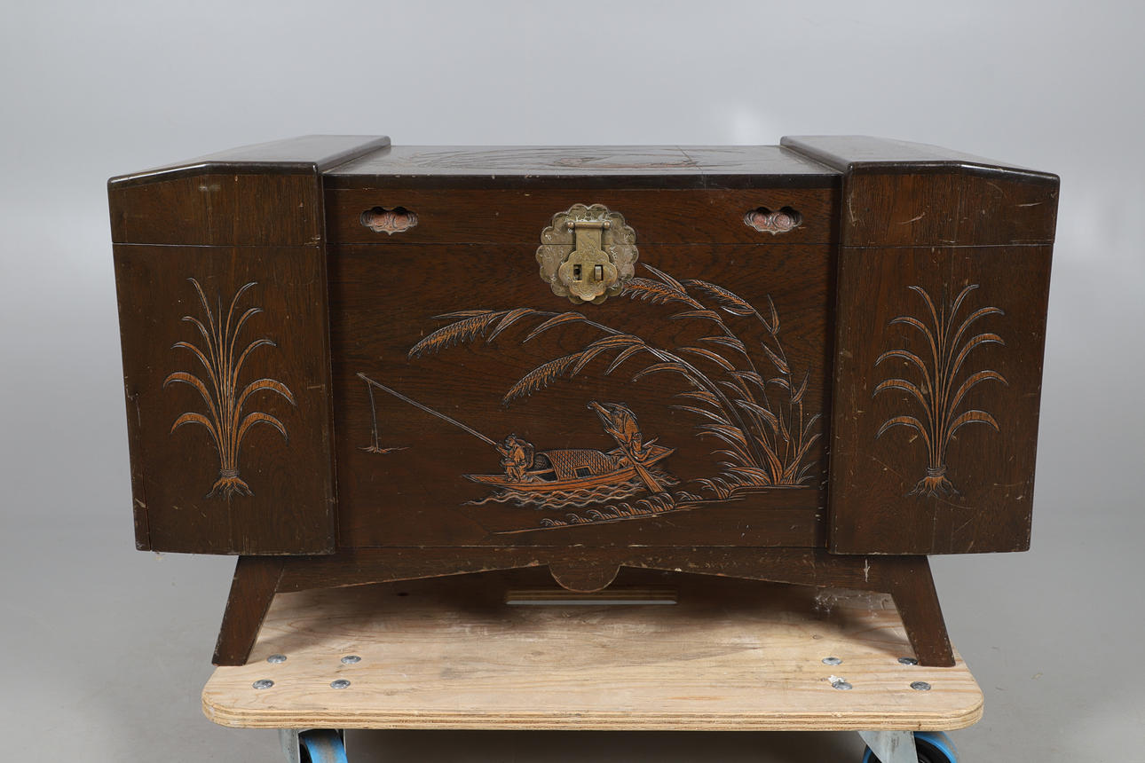 A camphorwood trunk carved with figures in boats and various plants, with a tray to the interior. 92cms across, 53.5cms high.